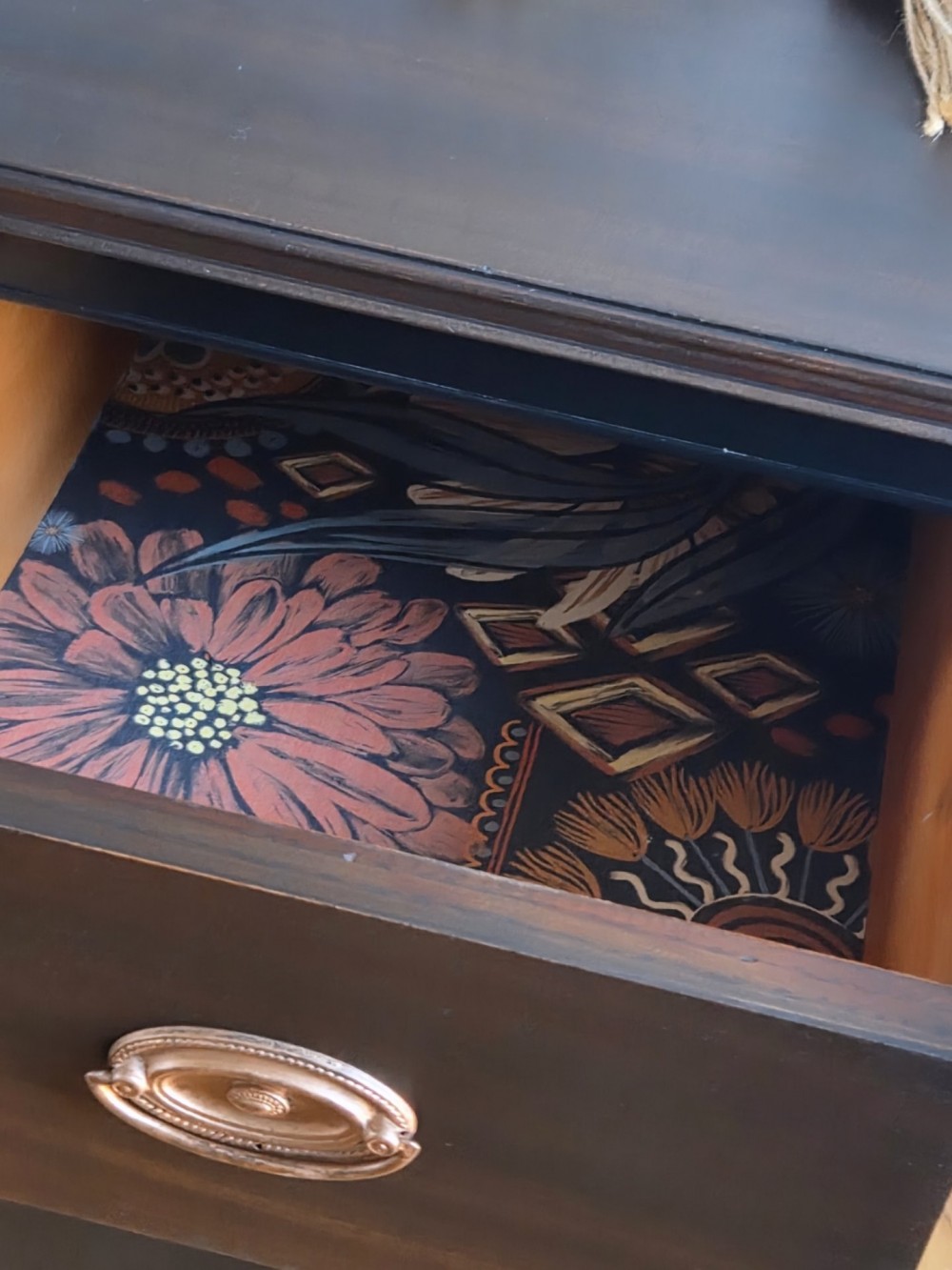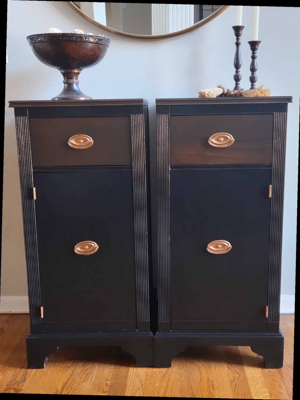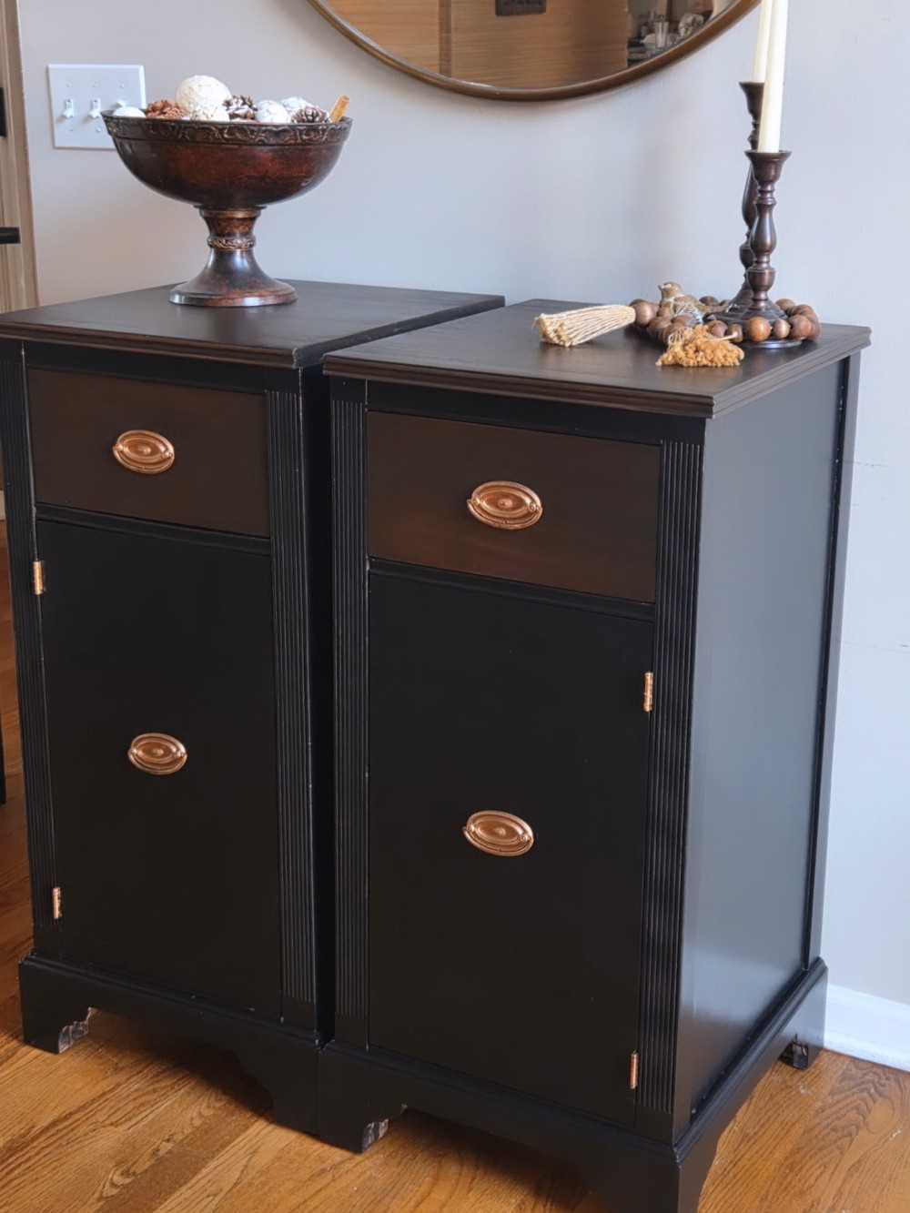 Tops and drawers sanded completely and stained in Varathane #kona. Rest scuffed and painted in Fusion Mineral Paint #coalblack. Sealed in satin poly for durability and protection. Drawers lined. Original hardware cleaned and polished.