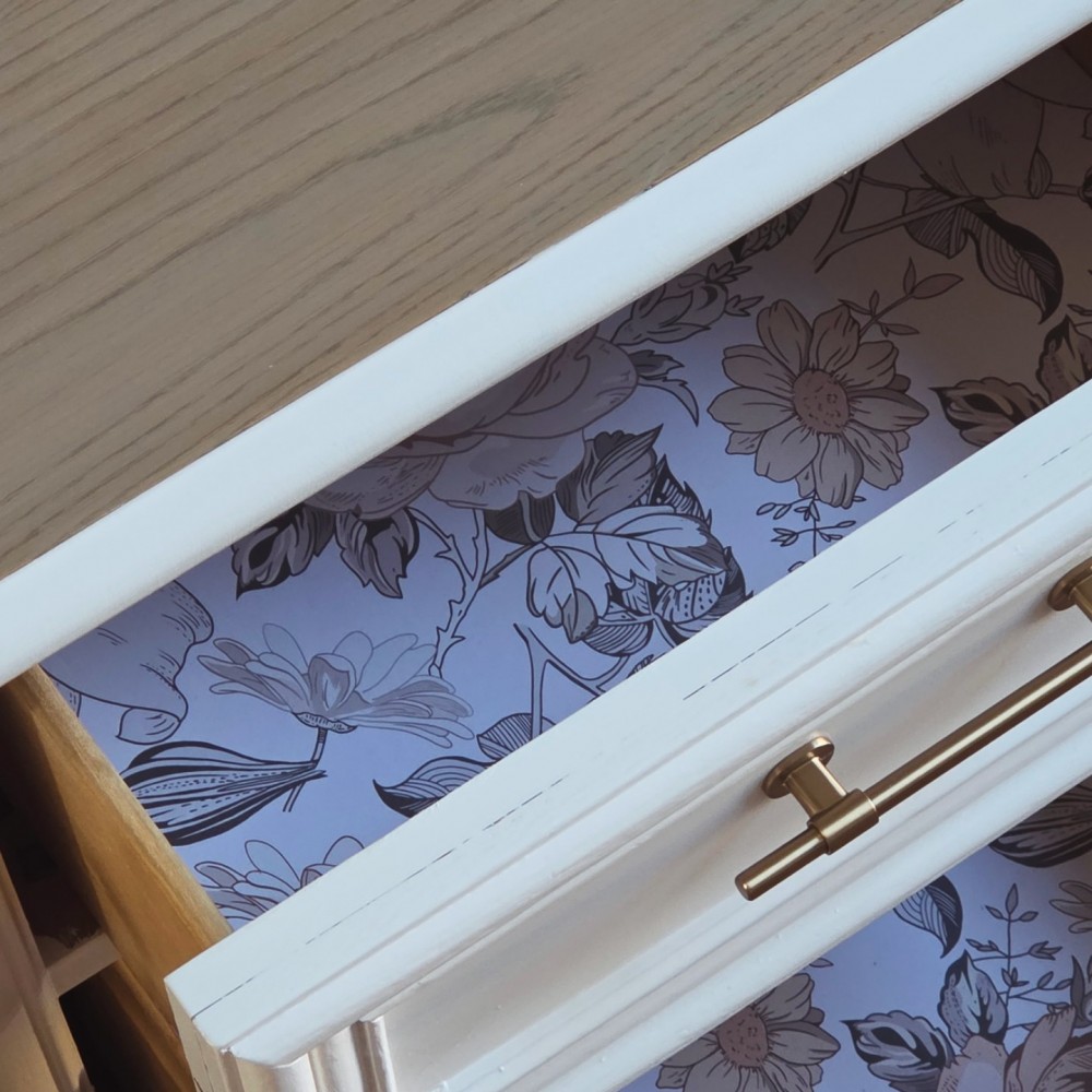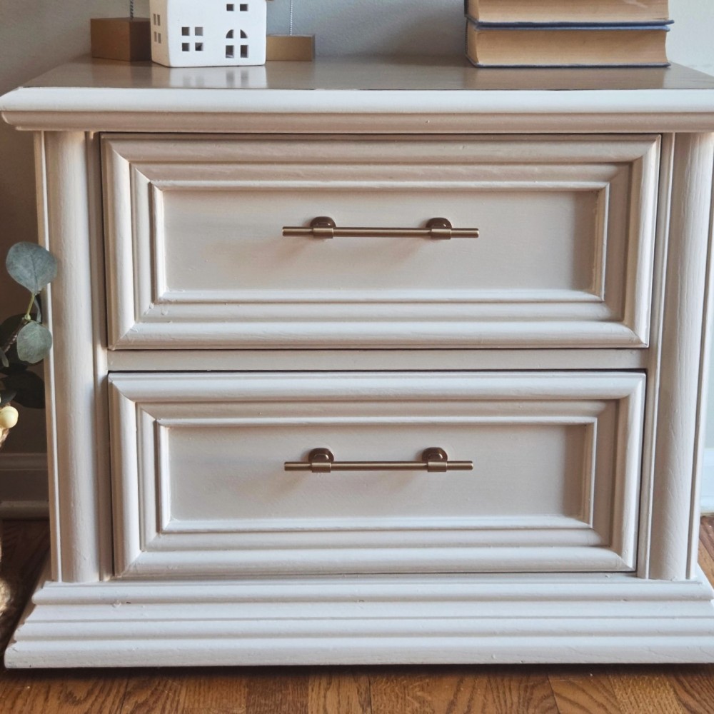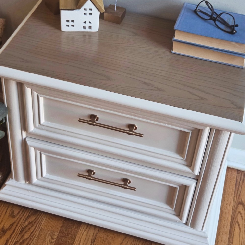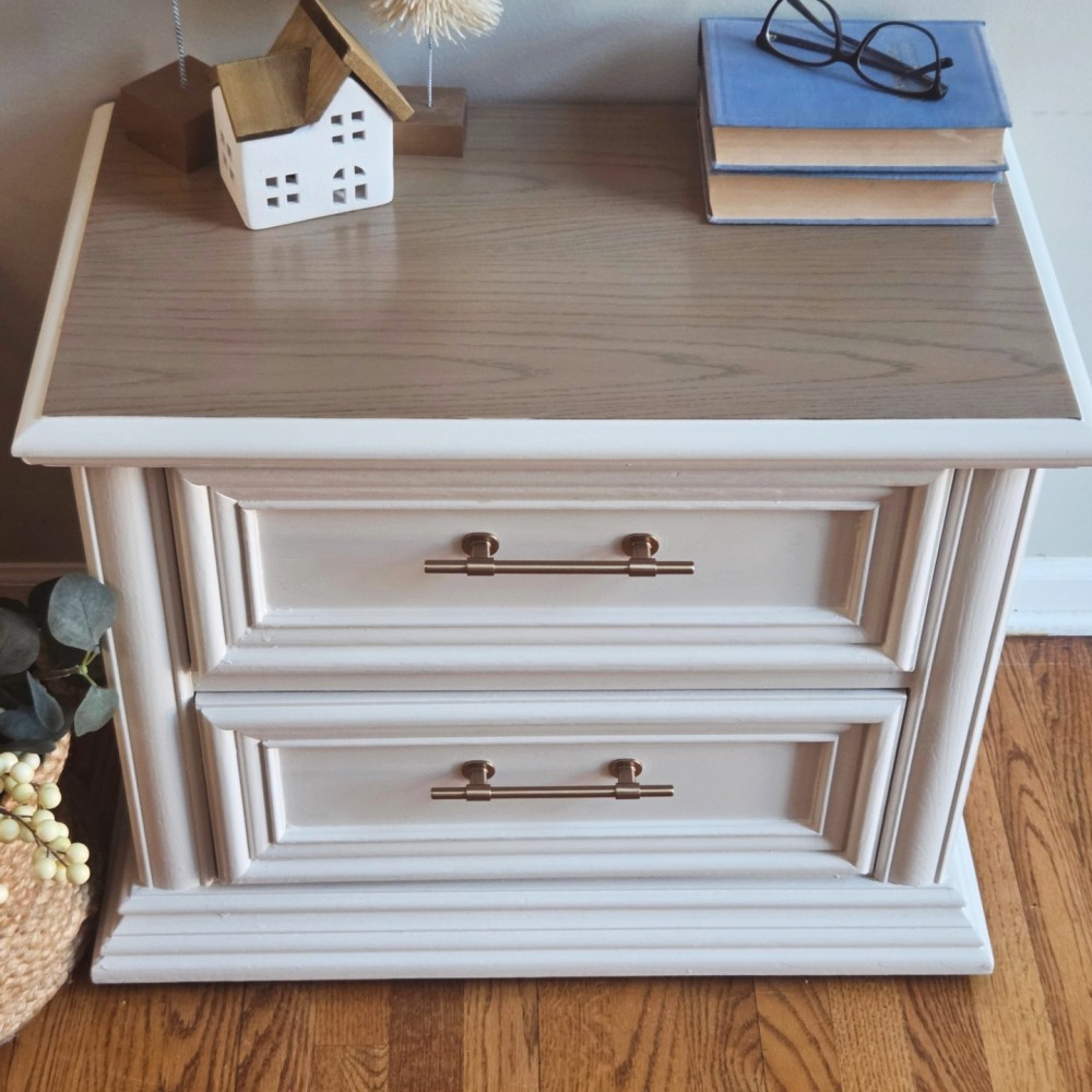 Top completely sanded and washed in fusionmineralpaint algonquin. Gel stain mudlide applied over it. Rest painted in melange ONE paparie white. Top sealed in satin poly. Both drawers in excellent working condition and fully lined. New hardware.