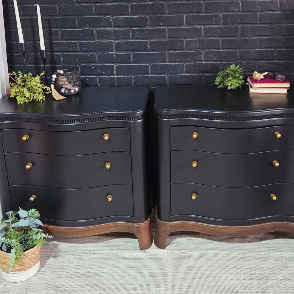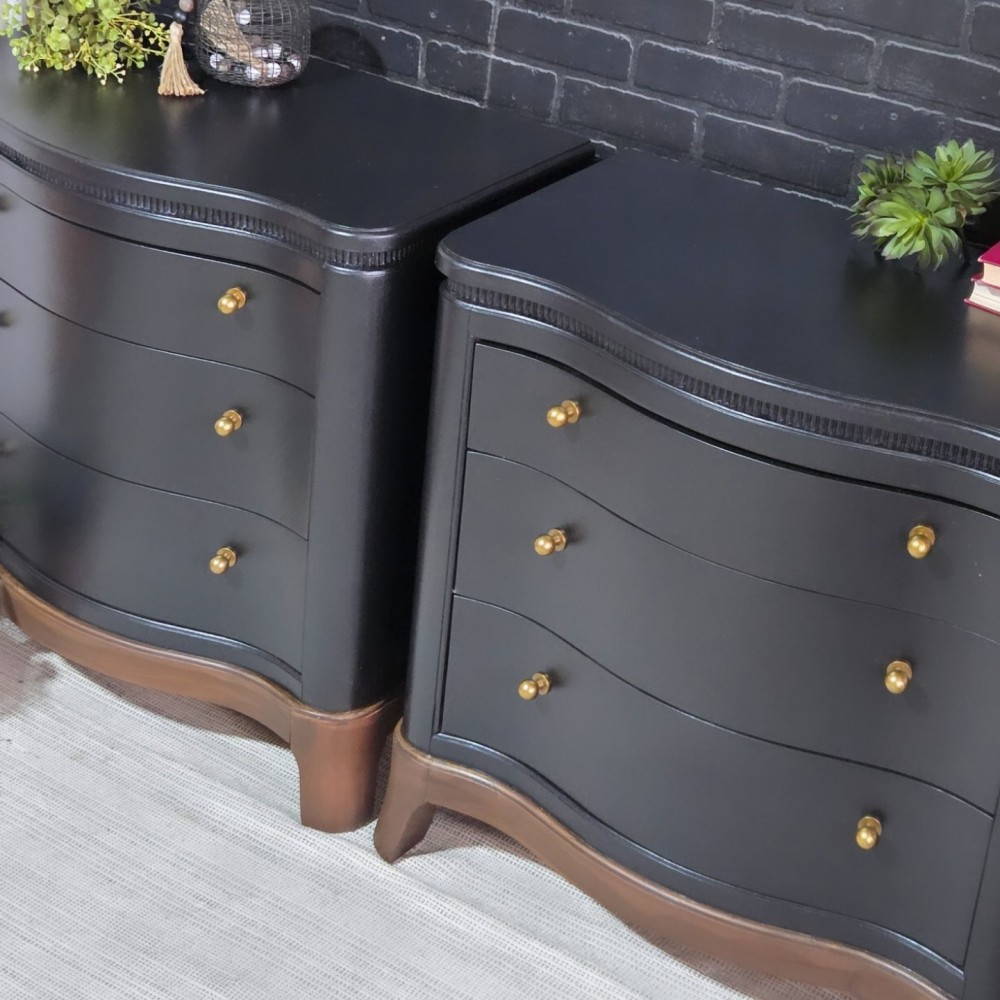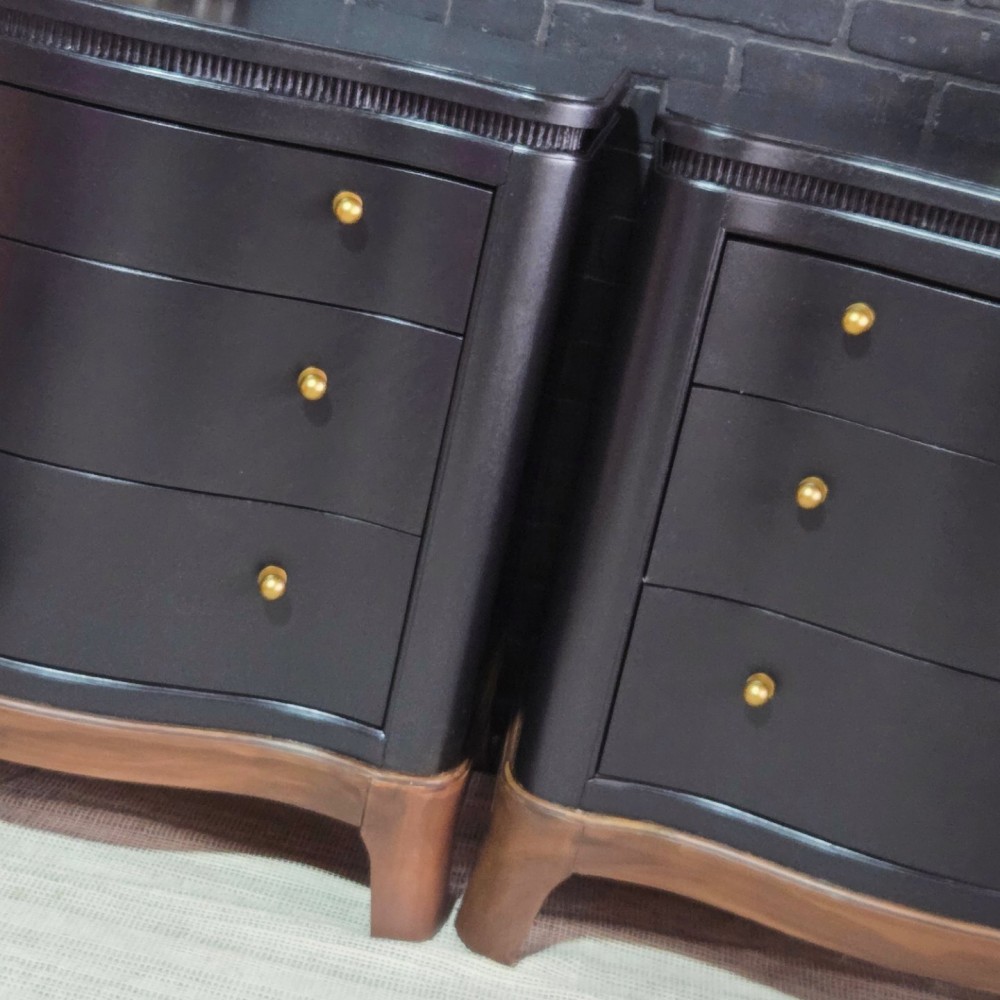 Bases stained in dark walnut. Rest painted in miracle paint in black. Sealed in satin poly for durability and protection. All drawers in excellent working condition and fully lined. New hardware.