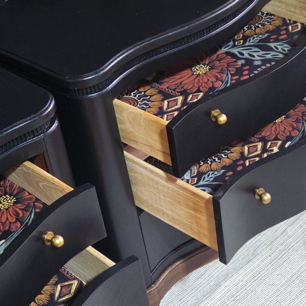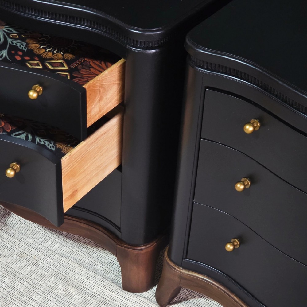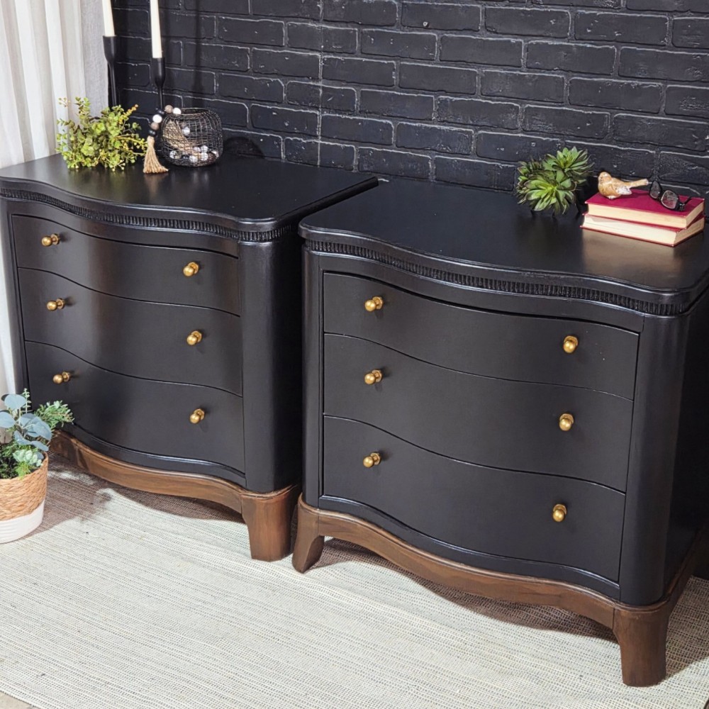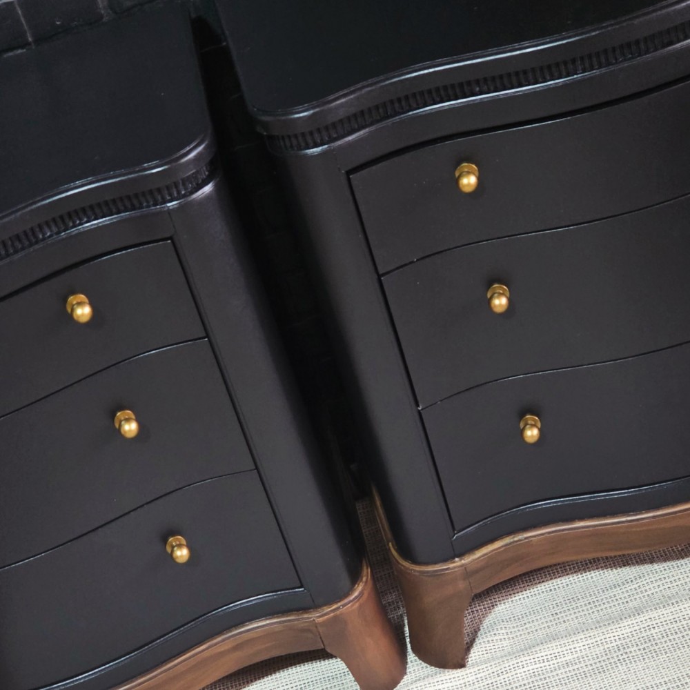 Bases stained in dark walnut. Rest painted in miracle paint in black. Sealed in satin poly for durability and protection. All drawers in excellent working condition and fully lined. New hardware.