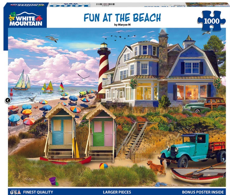 Its a beautiful day at the beach. People flock to the surf to soak up some vitamin D. Some choose to hang out on the sand, under umbrellas, while others are all about the water. A group of wind surfers have just cast off and coast while getting their sea legs, observing the sail boat drifting nearby. Artist Maryse M brings the sea breeze to you without the sand in this 1000 piece jigsaw puzzle. Finished size 24" x 30".