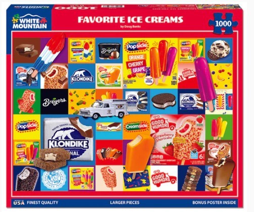 Summer favorites, birthday treats, and the perfect remedy for whatever ails you, there is always room for ice cream. Klondike, Breyers, Good Humor, and Popsicle. No matter the brand you prefer, designer Doug Banks gathered images of your favorite frozen treats in this 1000 piece jigsaw puzzle. Finished size 24" x 30".