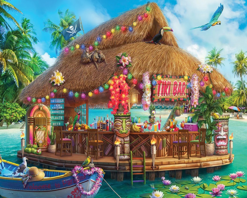 Swim up to the bar and have a drink. Mocktails and cocktails taste better with a tropical view. A toucan sits on top of the palm fronds watching the water while a macaw soars above. Even a family on monkeys finds it hard to resist the Floating Tiki Bar. Artist Olena transports you to the tropics with this 1000 piece jigsaw puzzle. Finished size 24" x 30".