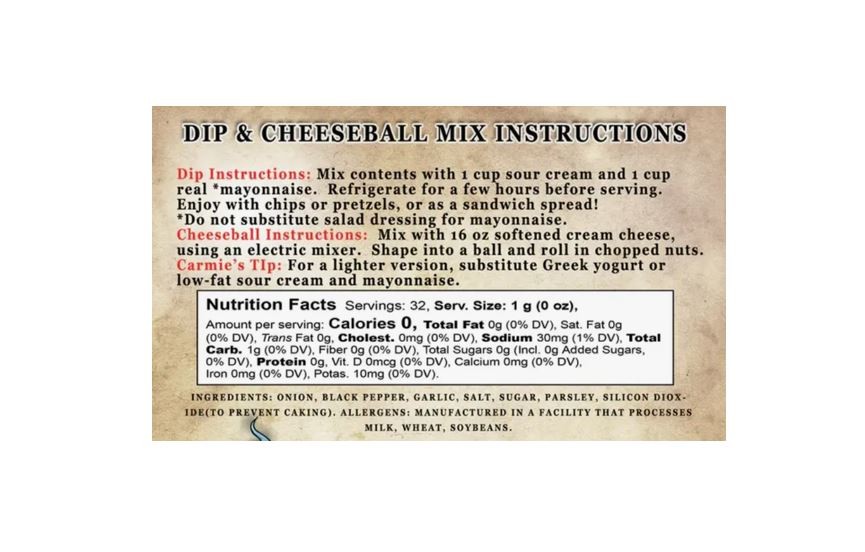 Named after Carmie’s husband JR, this traditional combination of black pepper, garlic, and other spices keep ‘em coming back for more! Add sour cream or a mixture of sour cream and mayo to create 2 cups of a delicious dip! We recommend serving with potato chips, pretzels, toasted bread slices, or with your favorite vegetables. You can also prepare a cheeseball by adding to 16 oz softened cream cheese.