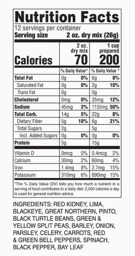 This classic 15 bean soup makes the kitchen smell as heavenly as it tastes! We use the finest kidney, lima, blackeye, great northern, pinto, and black turtle beans with green & yellow split peas and a load of tasty spices for a rich flavor you'll love. Add a can of crushed tomatoes, ham, kielbasa or chicken for a hearty meal. Serve with a warm loaf of bread and a dollop of sour cream and your meal is complete.