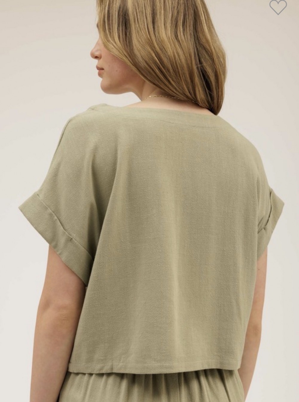 Rayon/ Linen. Body cut. Cropped. Pretty sage green color.