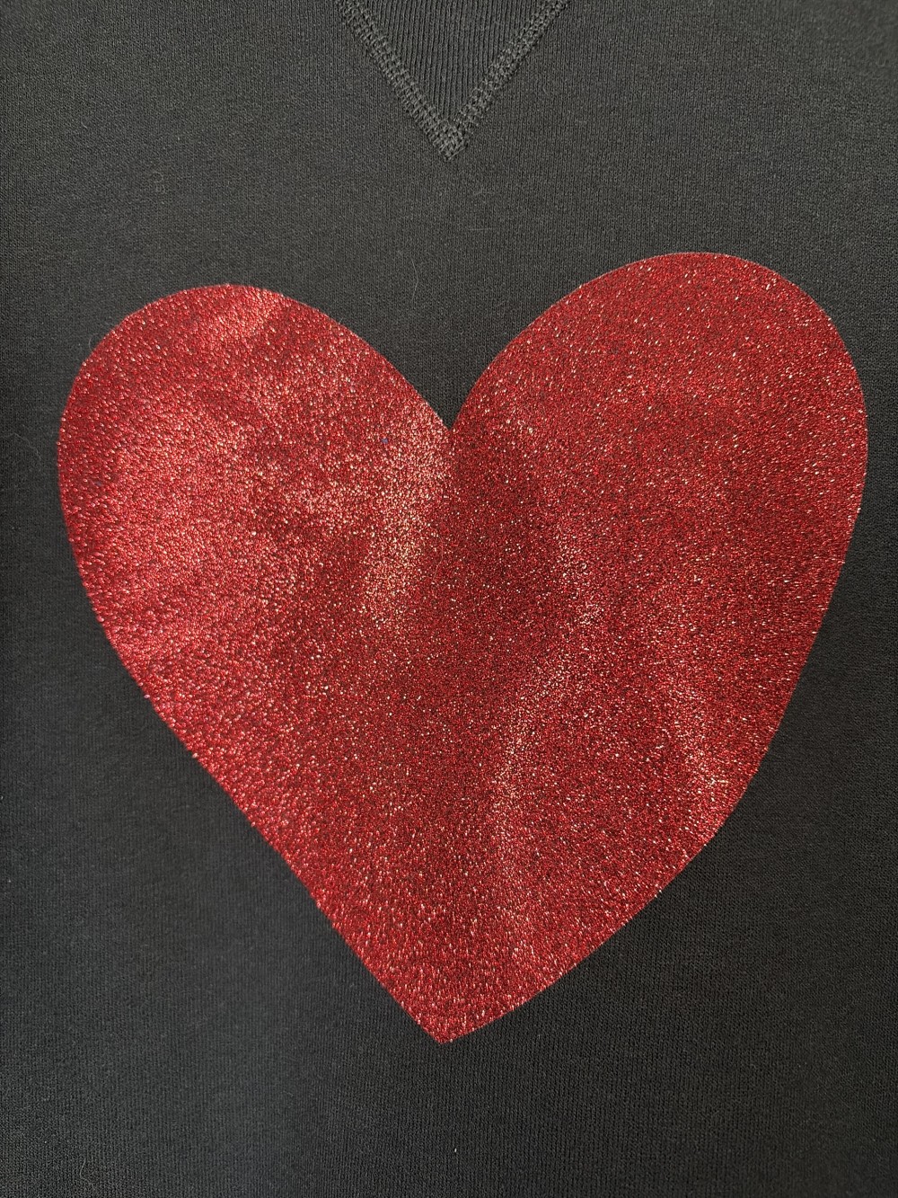 Black women’s cut sweatshirt with red glitter heart. 50% cotton, 50% polyester.