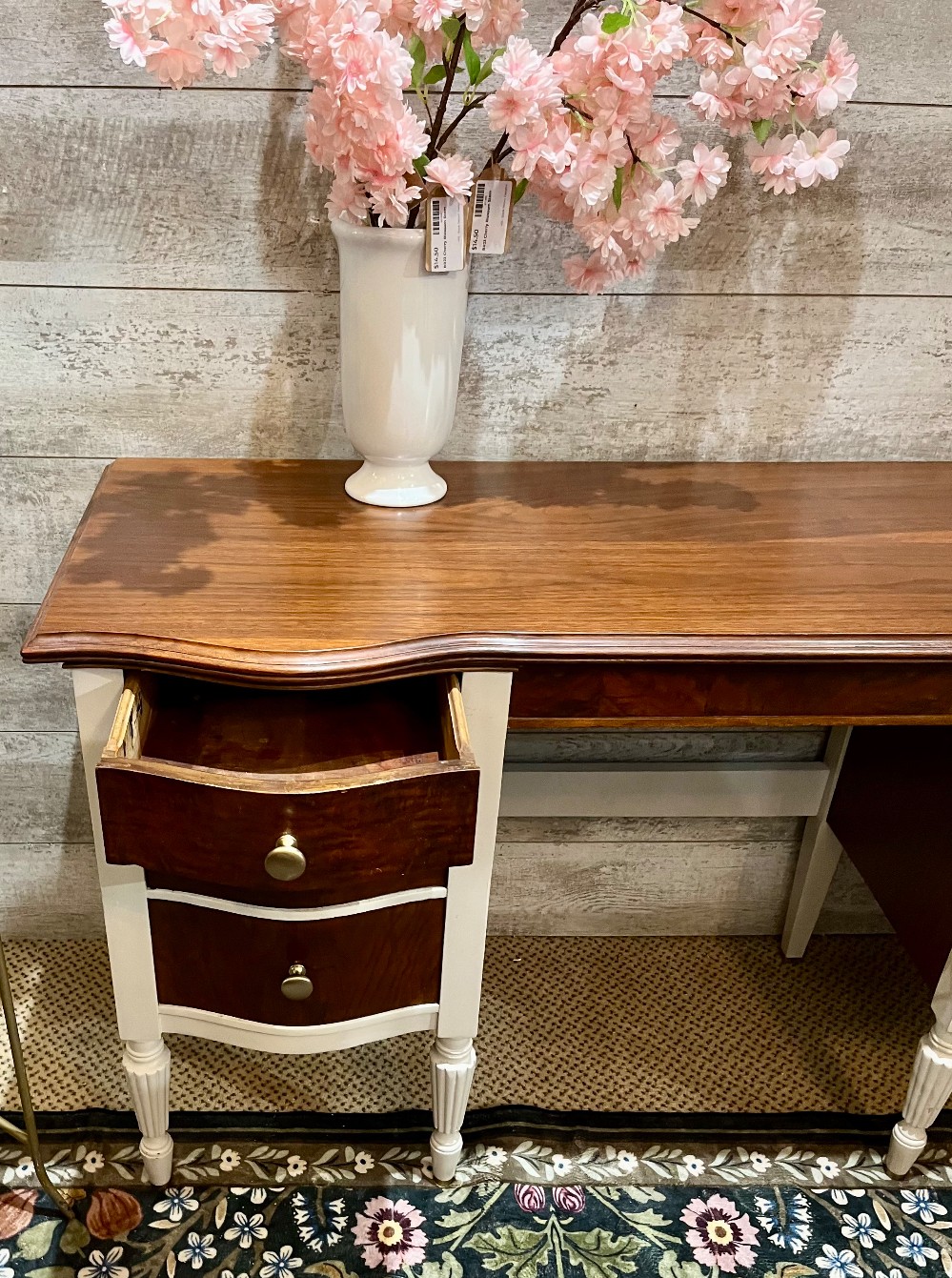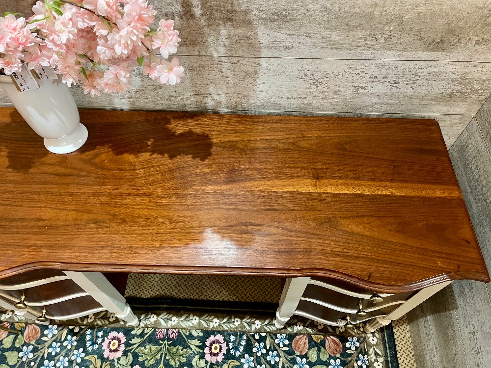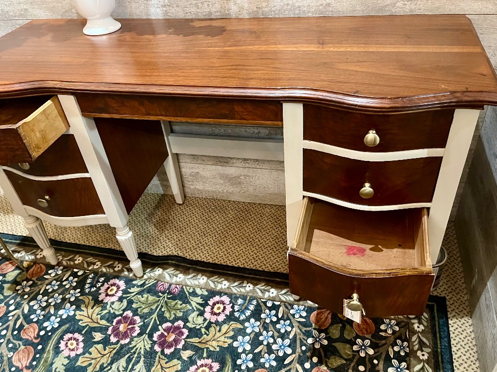 Beautiful vanity from the 1930’s. Some painting only highlights the beauty of the wood top and drawer fronts. New brushed champagne brass knobs. Original paint included with purchase.