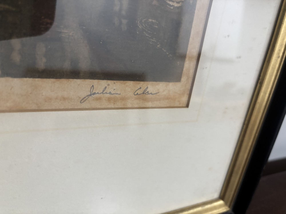 Vintage Engraved scene in Europe/Belgium frame in black and gold wood and glass front to protect the art. Photo shows artist signature. Size: 16 x 13.