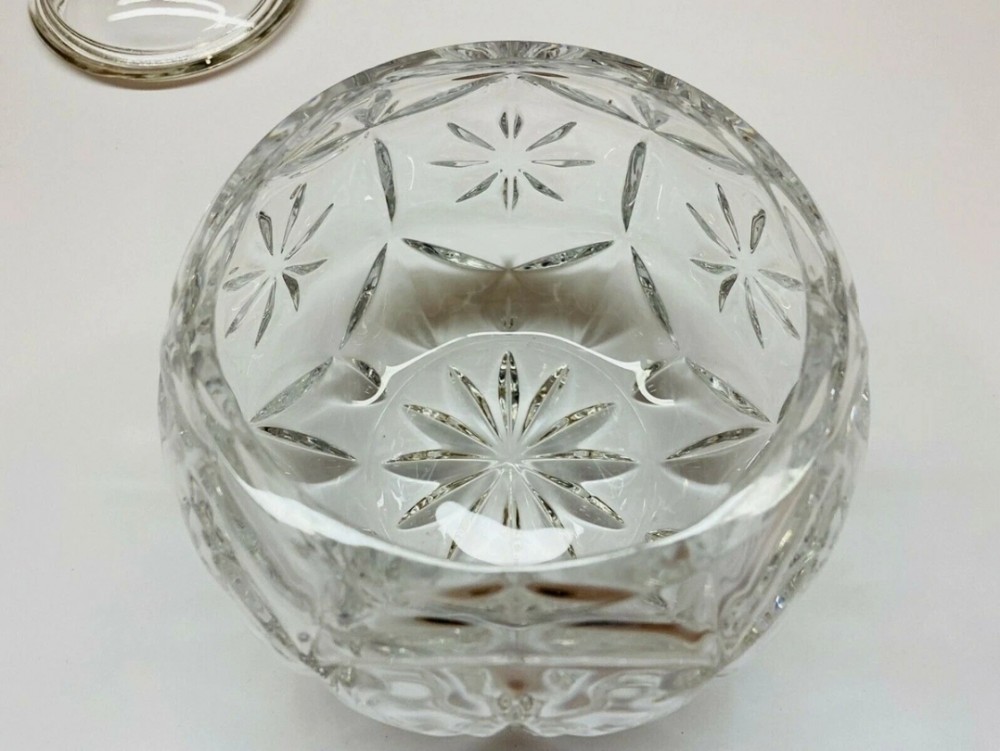 This vintage round lead crystal lidded candy jar has a diameter of 5 inches and a height of 5 inches. The jar is made of clear crystal glass, giving it an elegant and classic appearance. Its original vintage design adds a touch of nostalgia and charm to any space. Perfect for storing and displaying candies or other small treats, this candy jar is a versatile and stylish addition to any home decor.