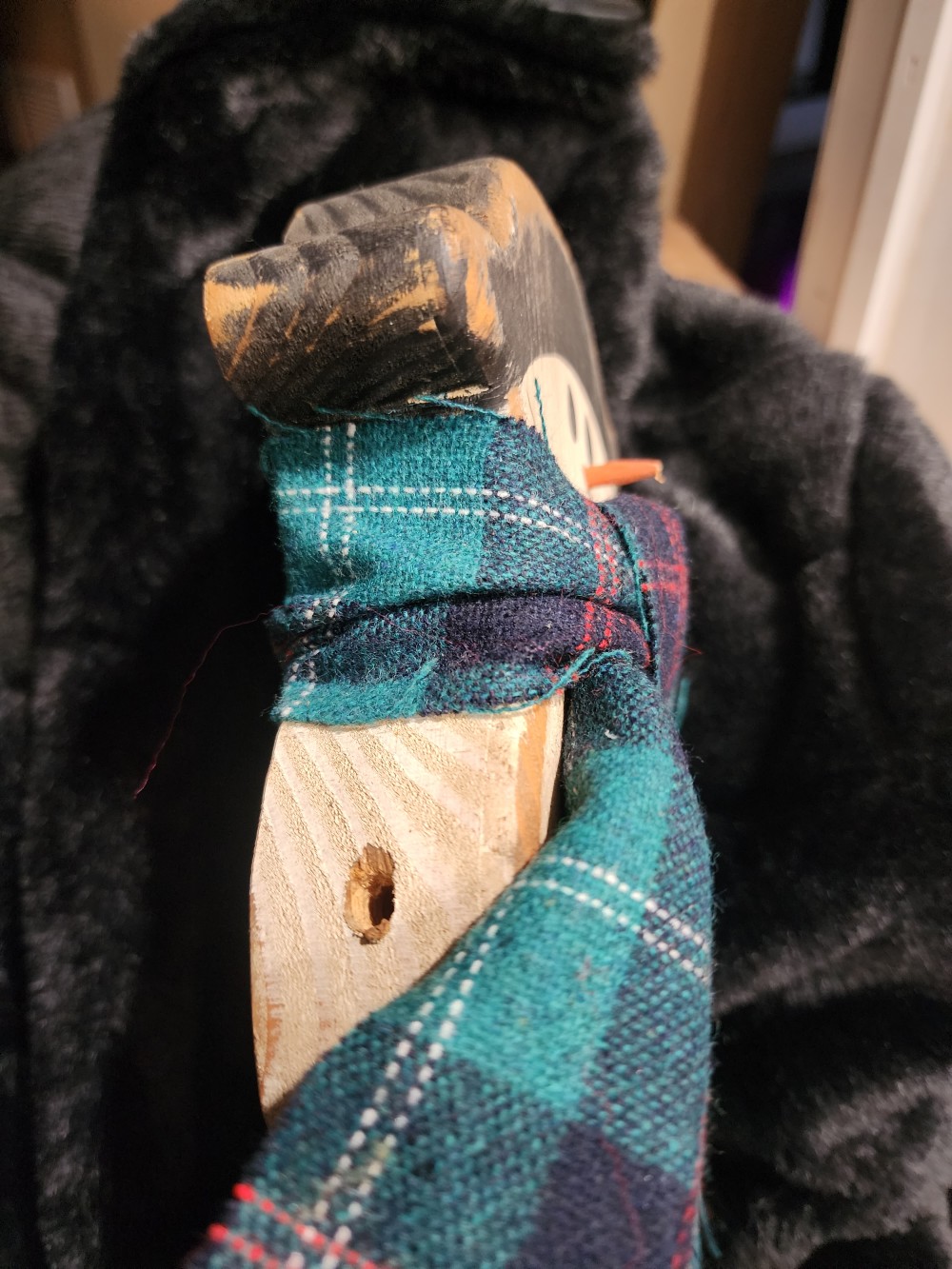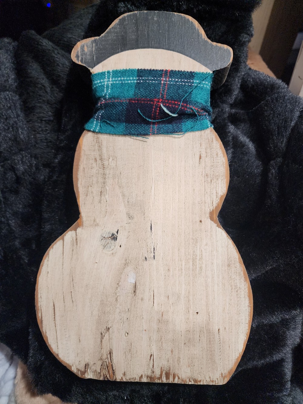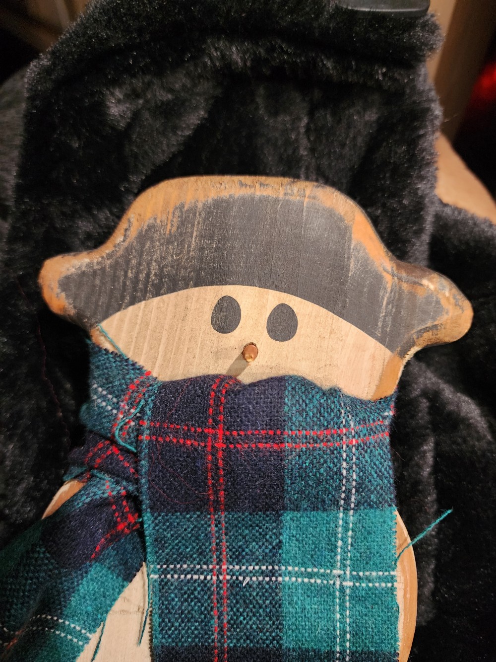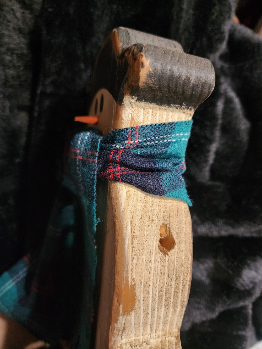 Handpainted wood snowman approximately 11 inches tall, 6 and a half inches at widest point, 1 and a half inches in depth. The snowman has holes on each side for actual Stick for stick arms.(sticks not included) Scarf is green checkered wool. He sits well on a shelf or table. Crafted approximately in 1995. used loved condition as seen on pictures..