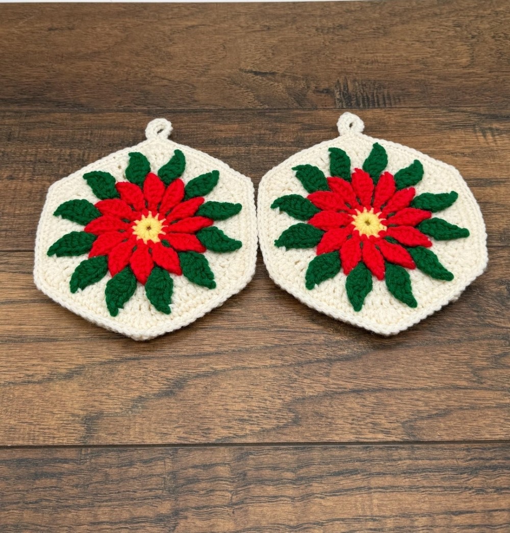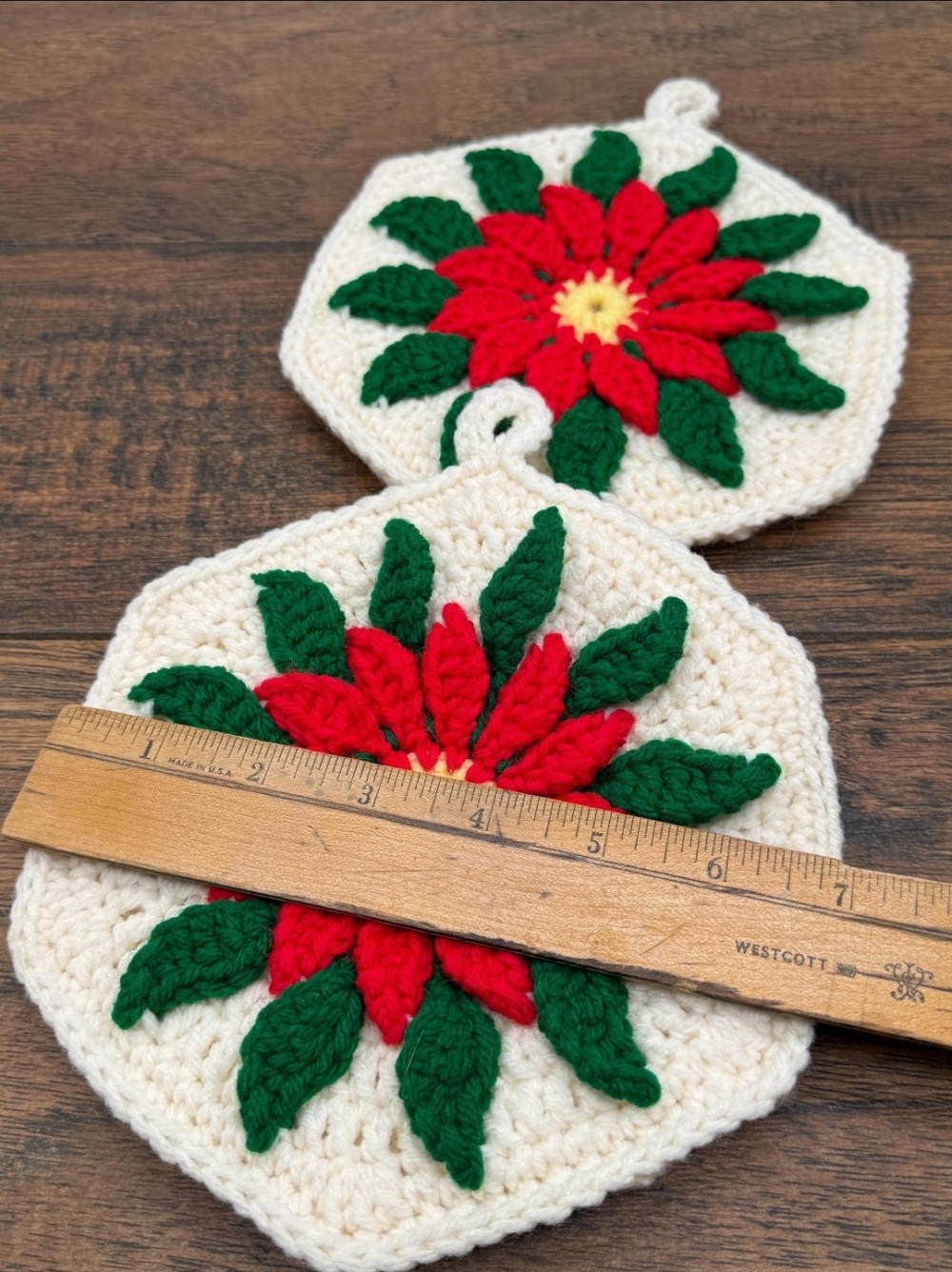 Brighten up your kitchen with these charming vintage hand-crocheted poinsettia pot holders! Crafted with care, each potholder features a festive poinsettia design that adds a touch of holiday cheer. Perfect for protecting your hands from hot pots and pans while also serving as delightful seasonal decor. A wonderful gift or a lovely addition to your own holiday kitchen!