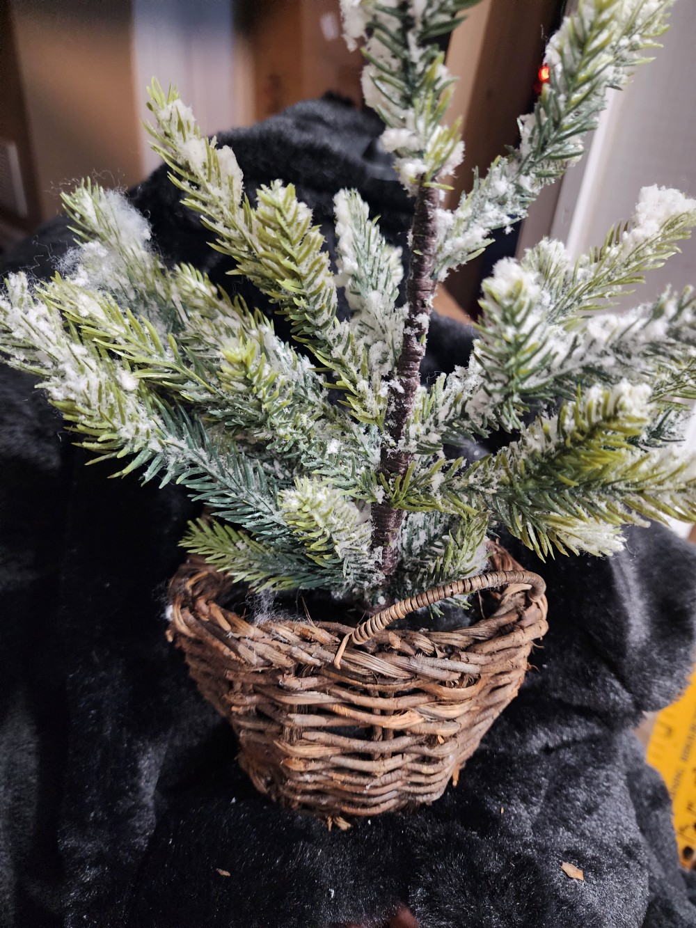 Vintage faux Christmas tree in a woven basket. About 12 inches tall