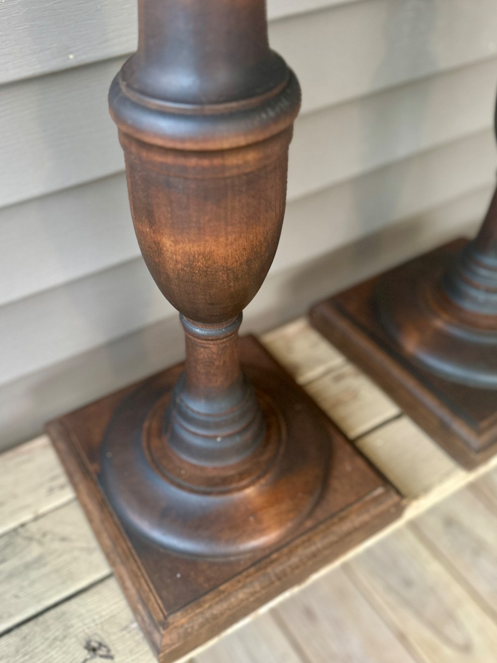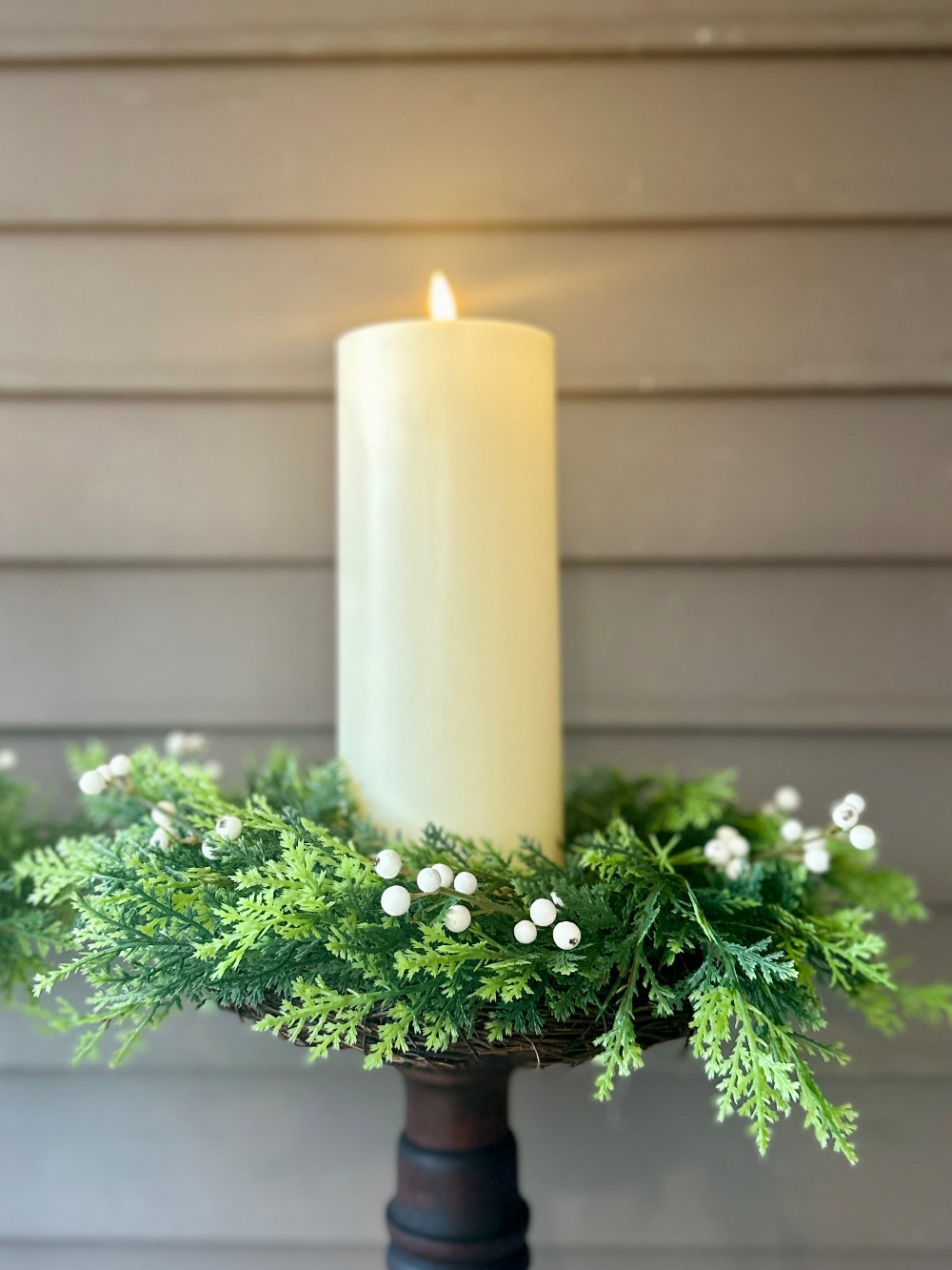 Stunning statement piece! Solid wood Walnut Vintage Candleholder, in fantastic condition. Set includes candleholder, 4"X14" flameless battery operated candle, with remote + lovely removable candle-ring wreath.