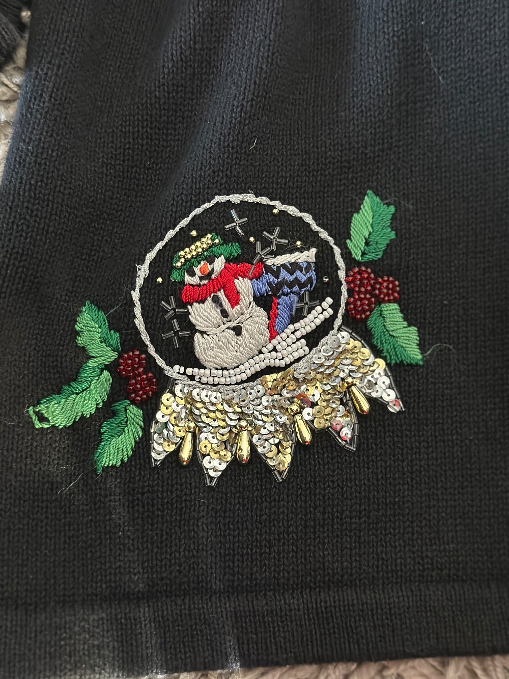 Delightful Vintage Cardigan with Snow Globes, including back of sweater, removable collar + loads of sparkle! Size Large.