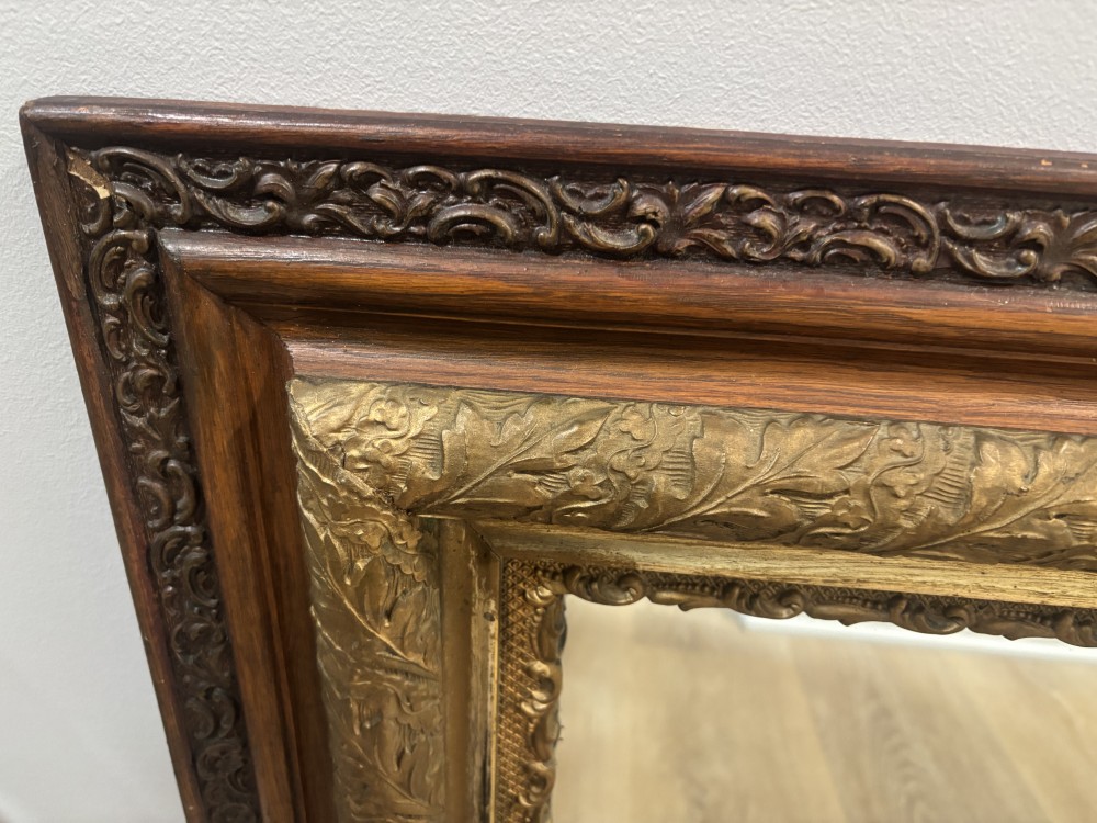 Vintage Wood double frame w/mirror that has stood the test of time. The two tone wood and built in mirror offers an amazing design. Size: 28 x 26.