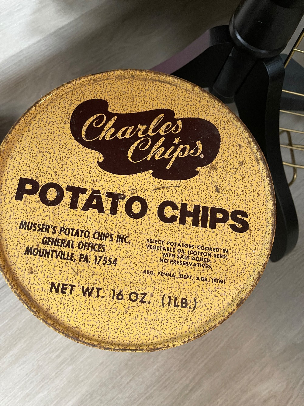 Located in Carol Stream. Vintage Charley’s Chips potato chip tin.