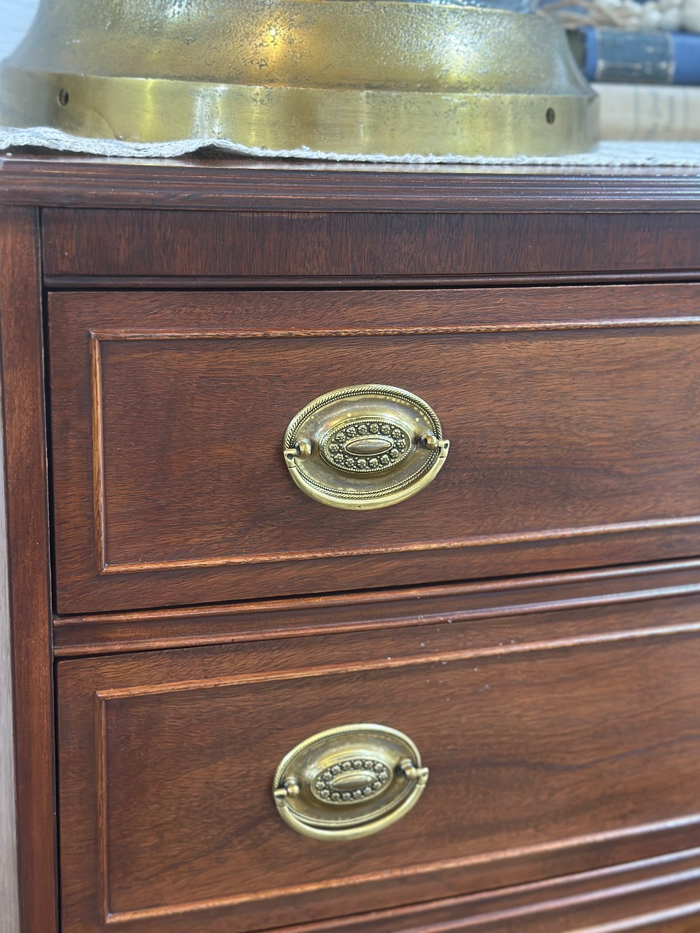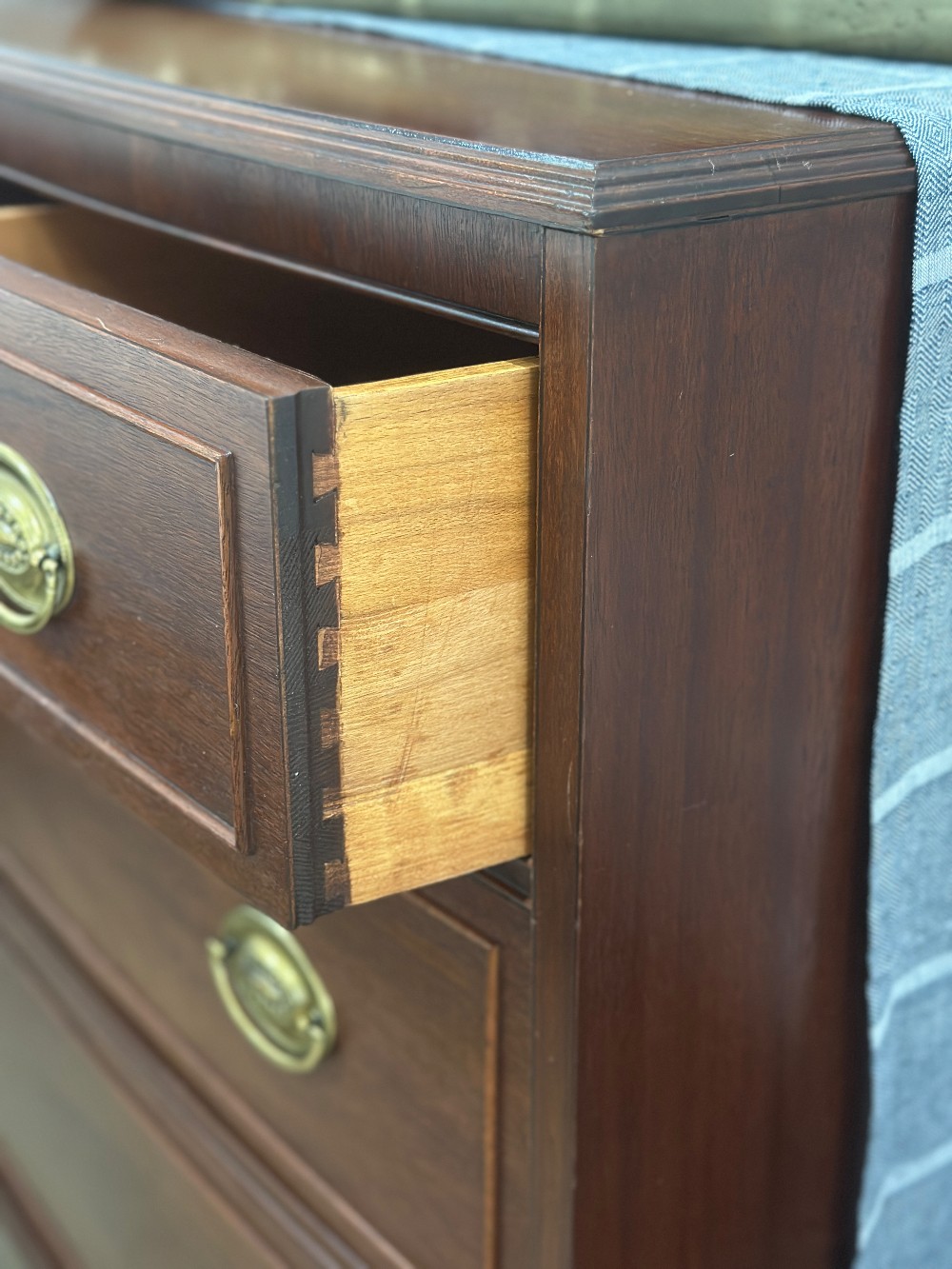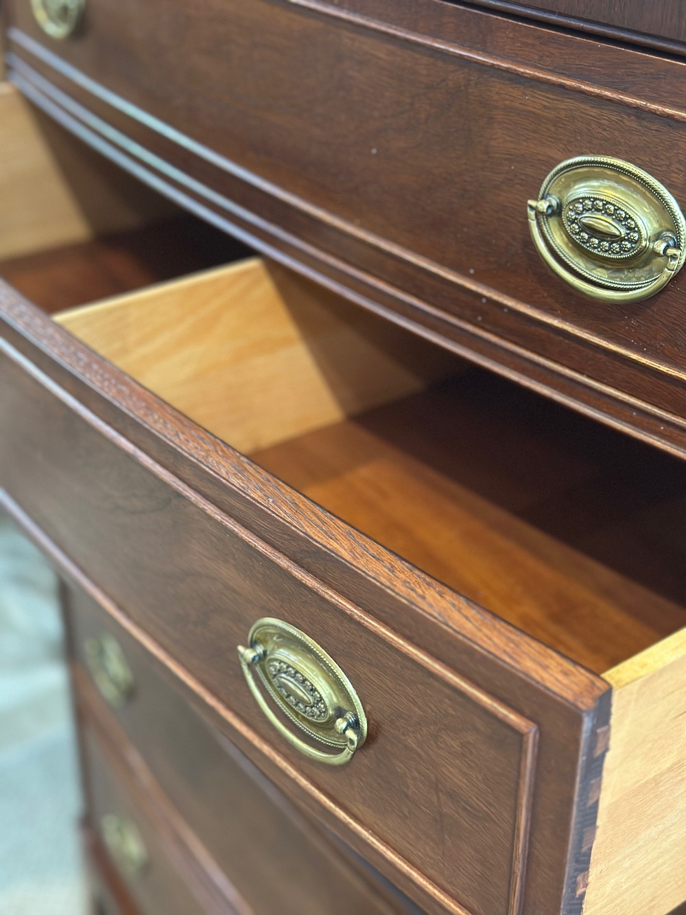 Stunning Antique 1920s Mahogany Chest, with a slightly bowed front, includes original hardware, one drawer divider and dovetail drawer construction. This chest is in impeccable condition.