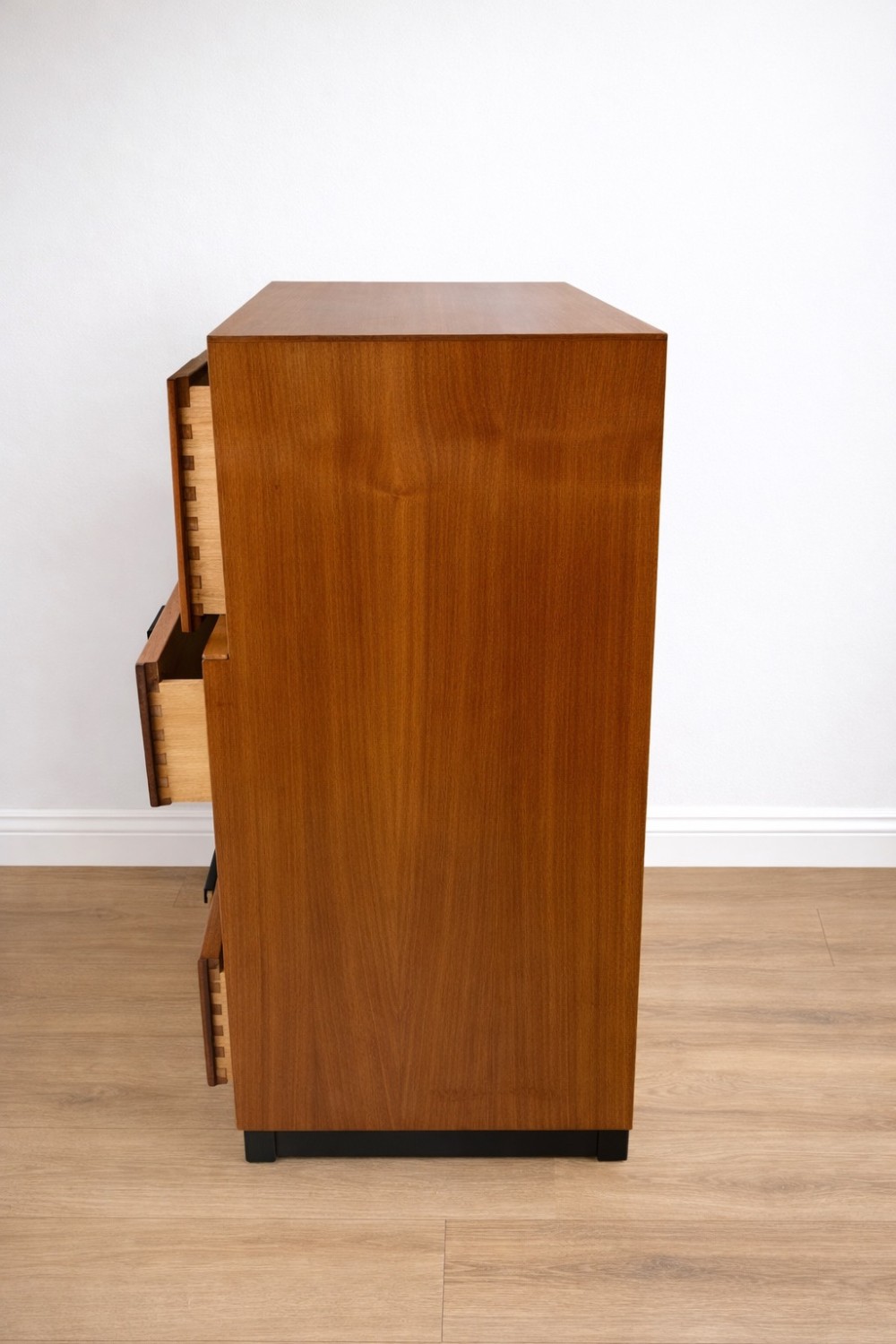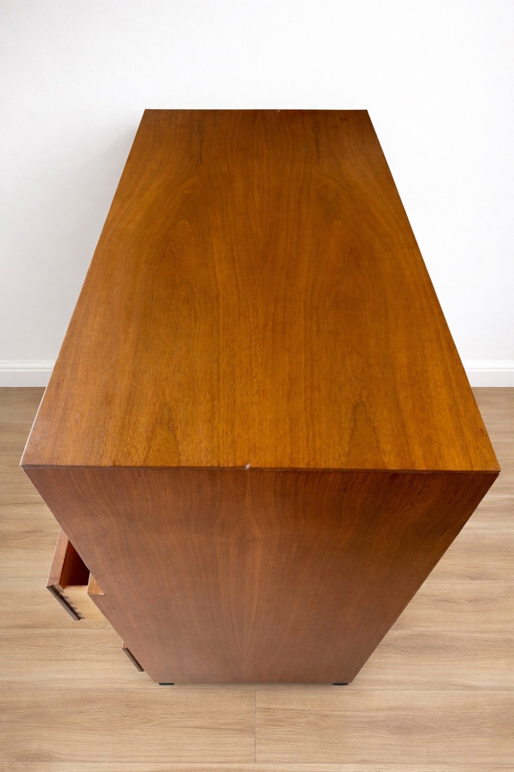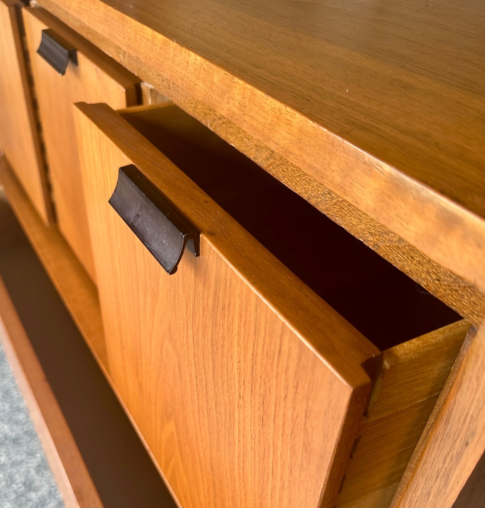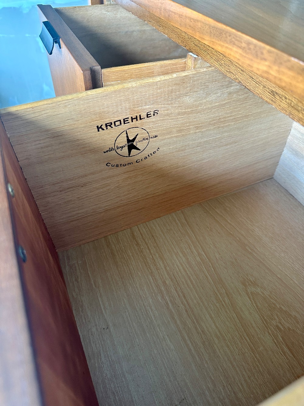 This two-tiered piece features clean mid-century lines, a versatile storage layout, includes all original metal drawer pulls and sits on its original Kroehler base plinth, giving it that classic low-profile MCM look.