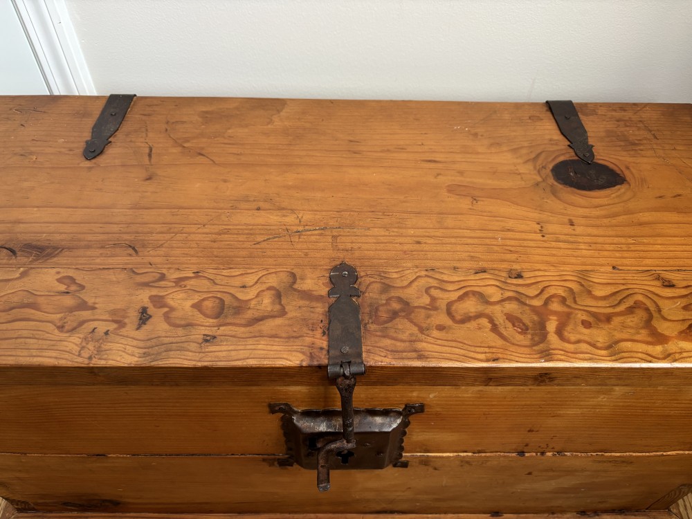 Vintage wood trunk w/latch and metal hinges. This is one unique find and extremely durable am I. Very good condition.