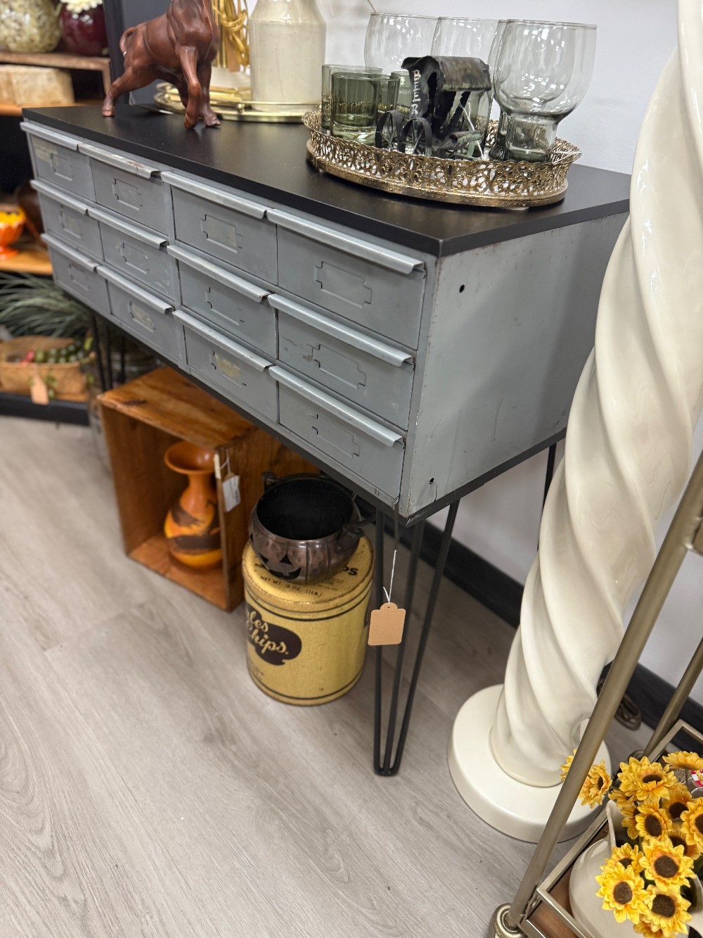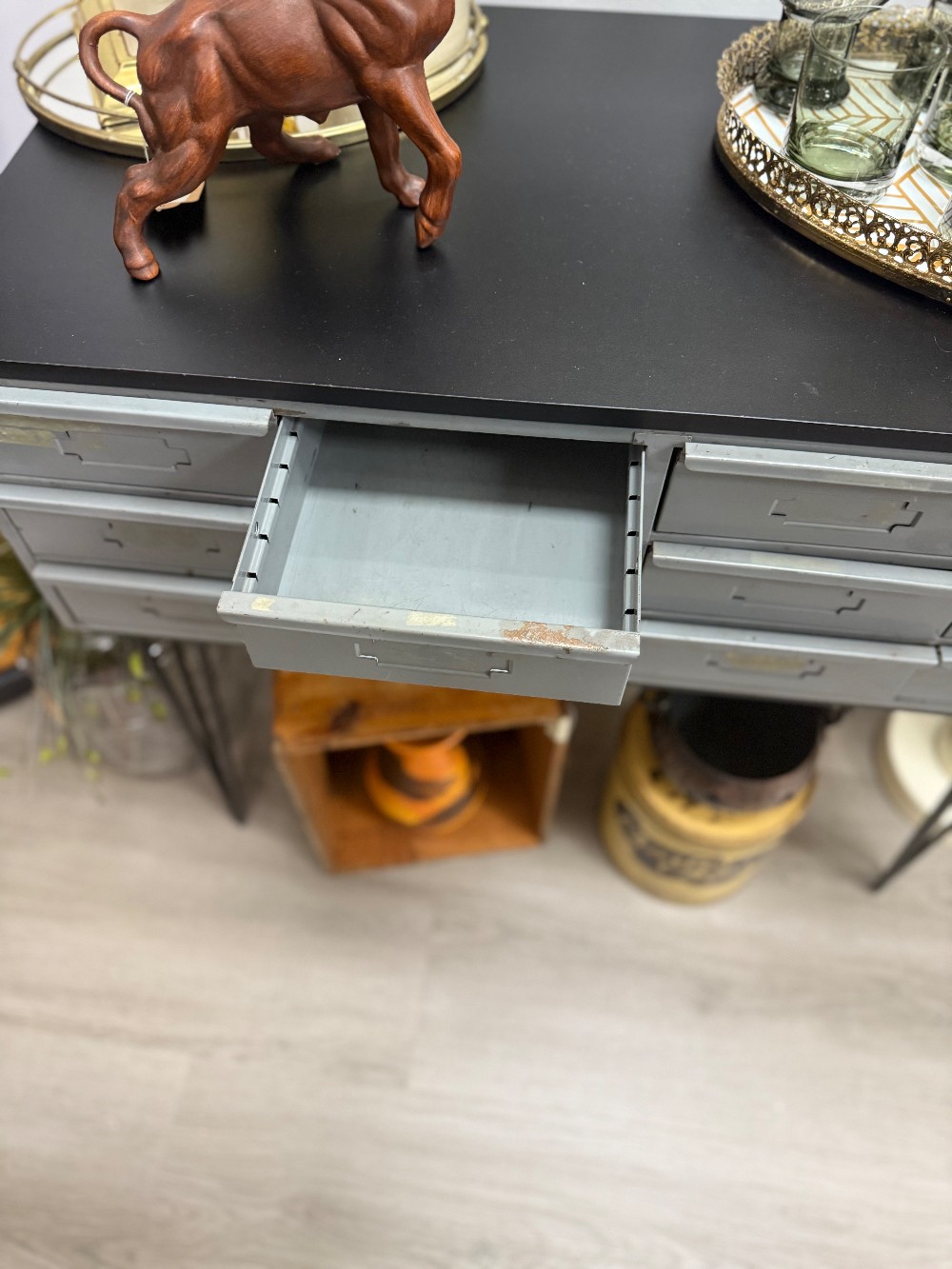 Hallowell metal card catalog cabinet. Comes with 12 interchangeable drawers. Drawers can be removed and reveals open shelving.
