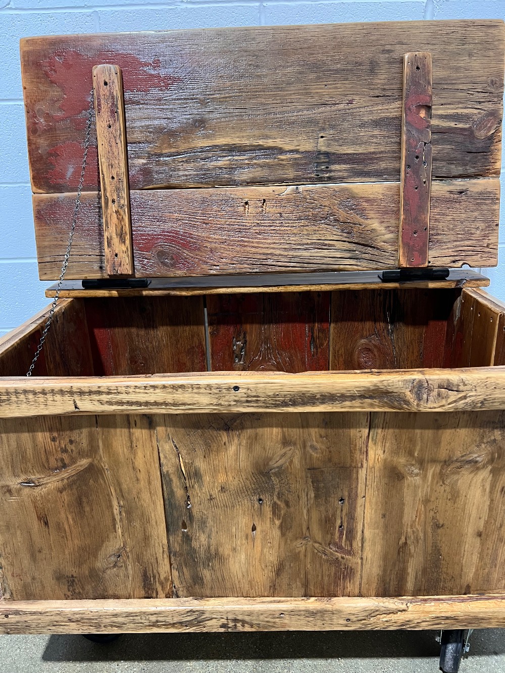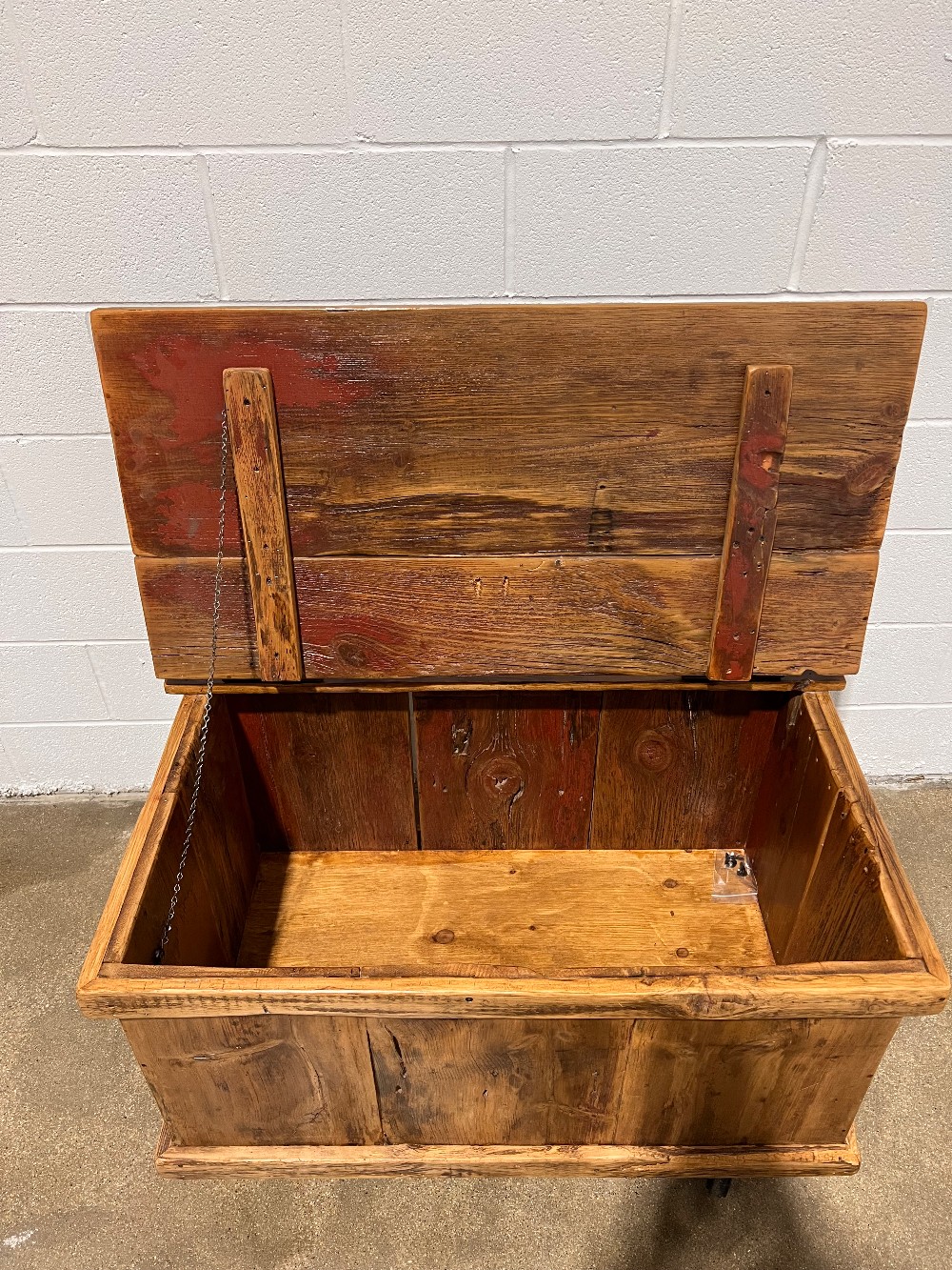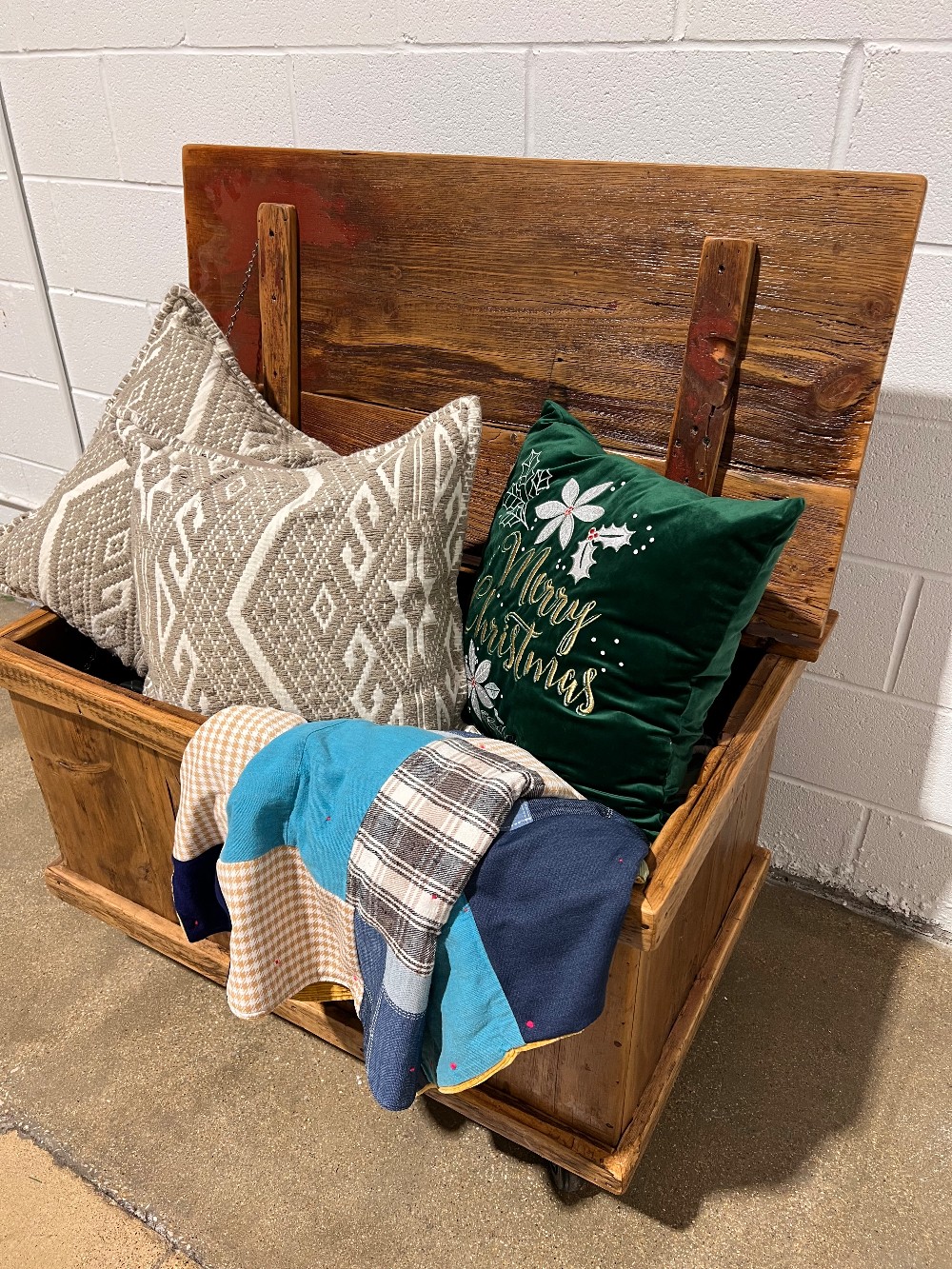 Handmade from upcycled barnwood. Pillows and blankets inside trunk sold SEPERATE. Available at the Carol Stream location - ask for our booth A Little Bit Of Rust Vintage. Pick up in store. Shop daily 10-6.