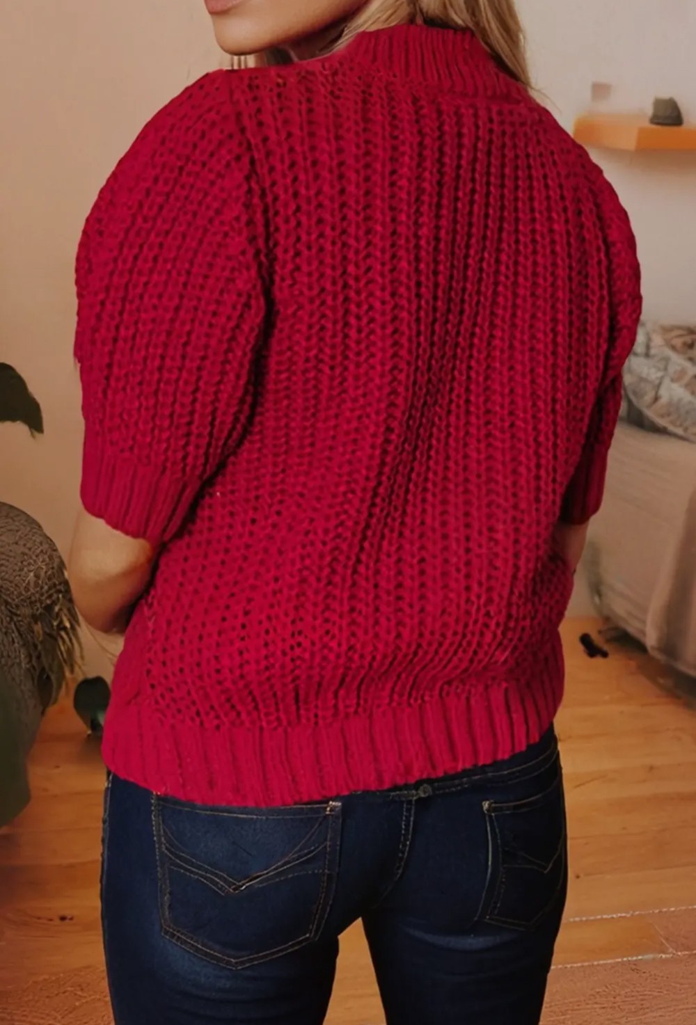 Get cozy in this charming red cable-knit sweater with a playful twist. Featuring classic plaid ribbon accents woven through the front and tied into sweet bows, this piece adds a festive, feminine touch to your winter wardrobe. The short sleeves and ribbed hem give it a modern fit that pairs perfectly with jeans or skirts for a chic holiday look.