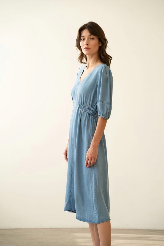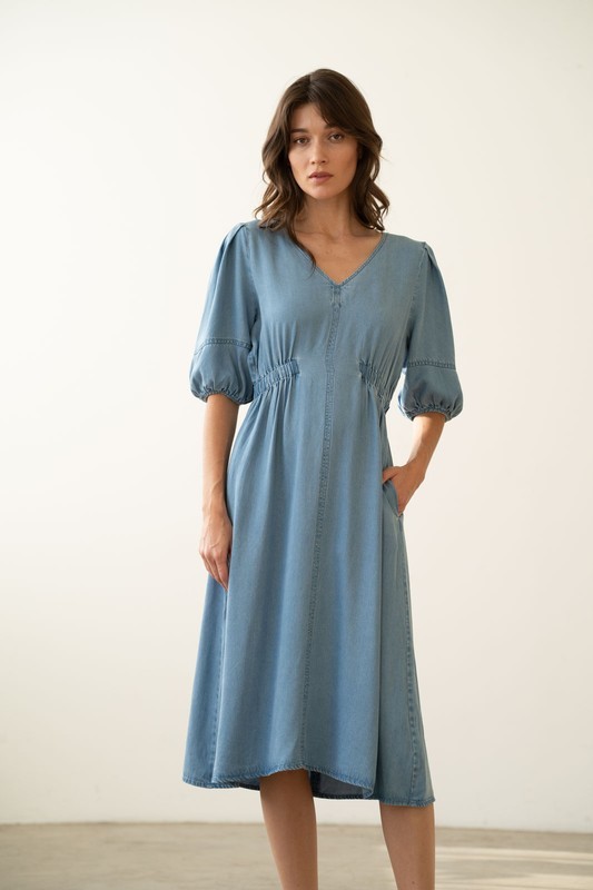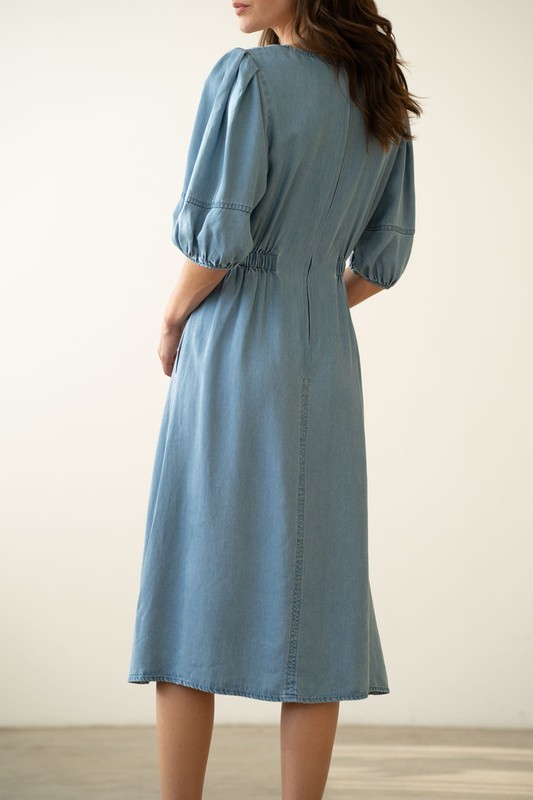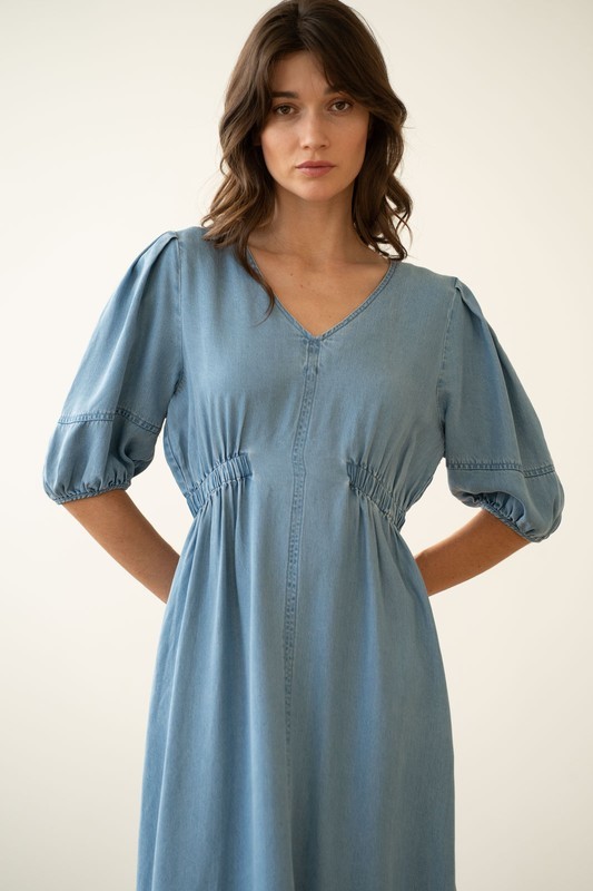 Crafted from lightweight chambray fabric, this midi dress features puff short sleeves, a flattering V-neckline, and a comfortable under-bust elastic detail for the perfect fit. Effortlessly stylish and versatile! / 100% rayon