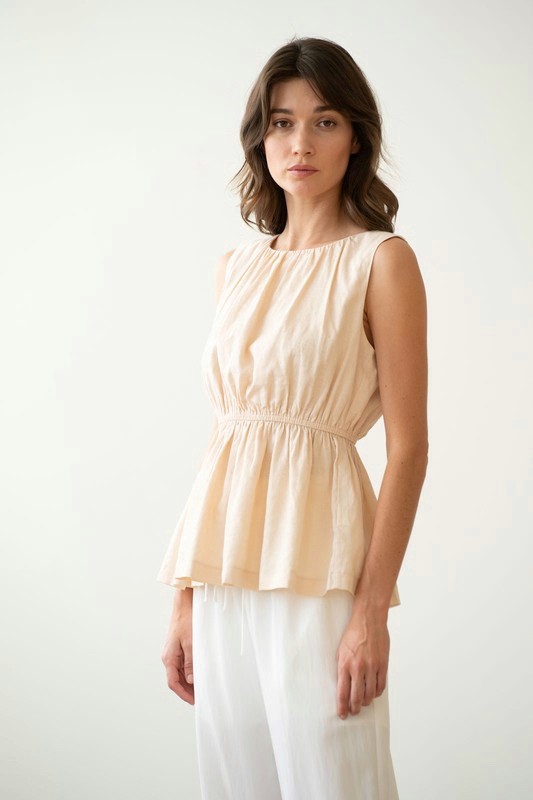 Designed for a flattering fit, this sleeveless top features a round neck, under-bust elastic, and a peplum silhouette for an effortlessly stylish look / 80% linen, 20% cotton