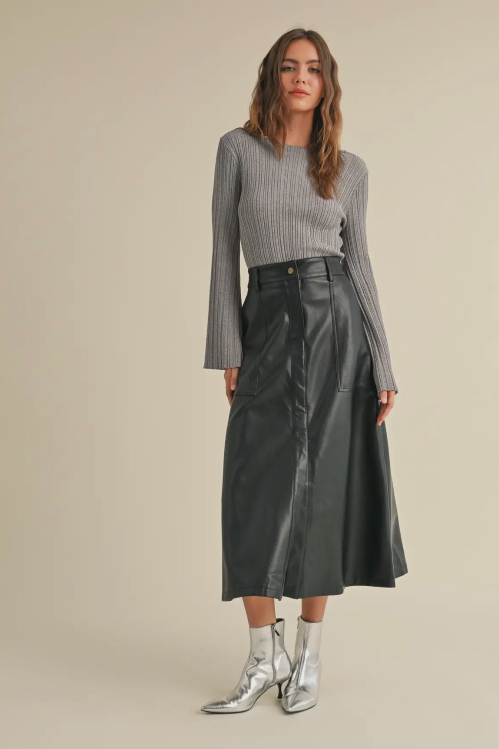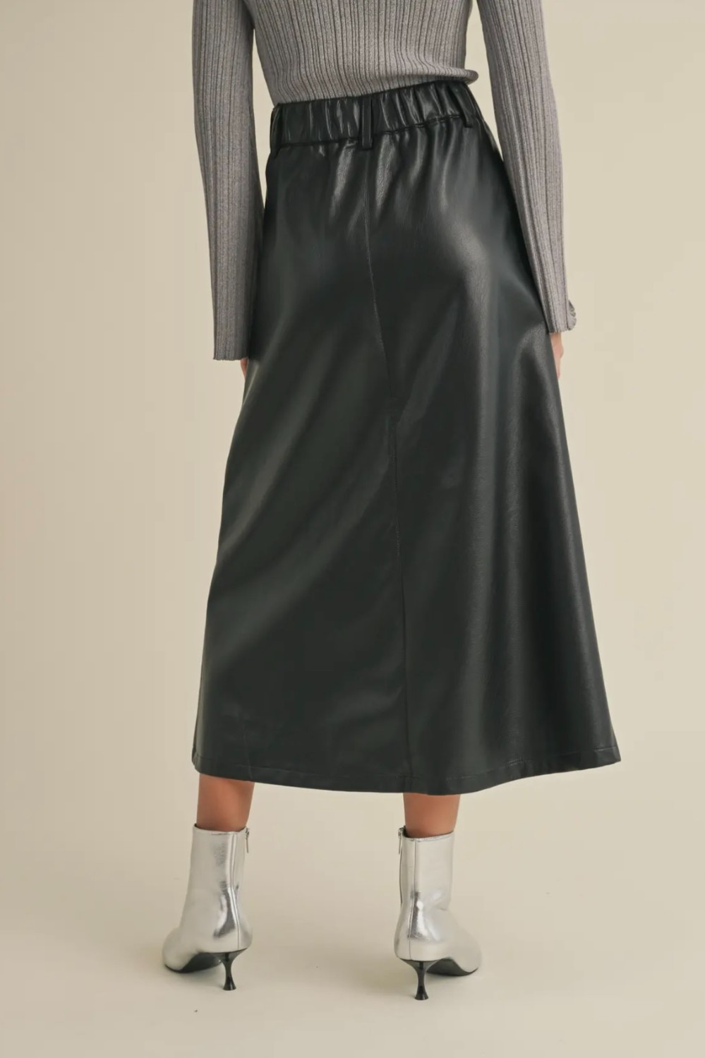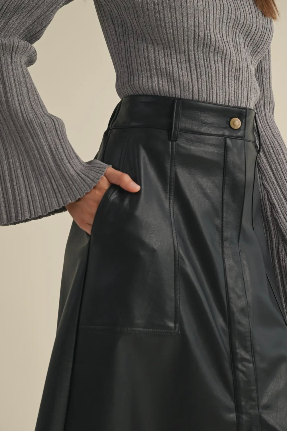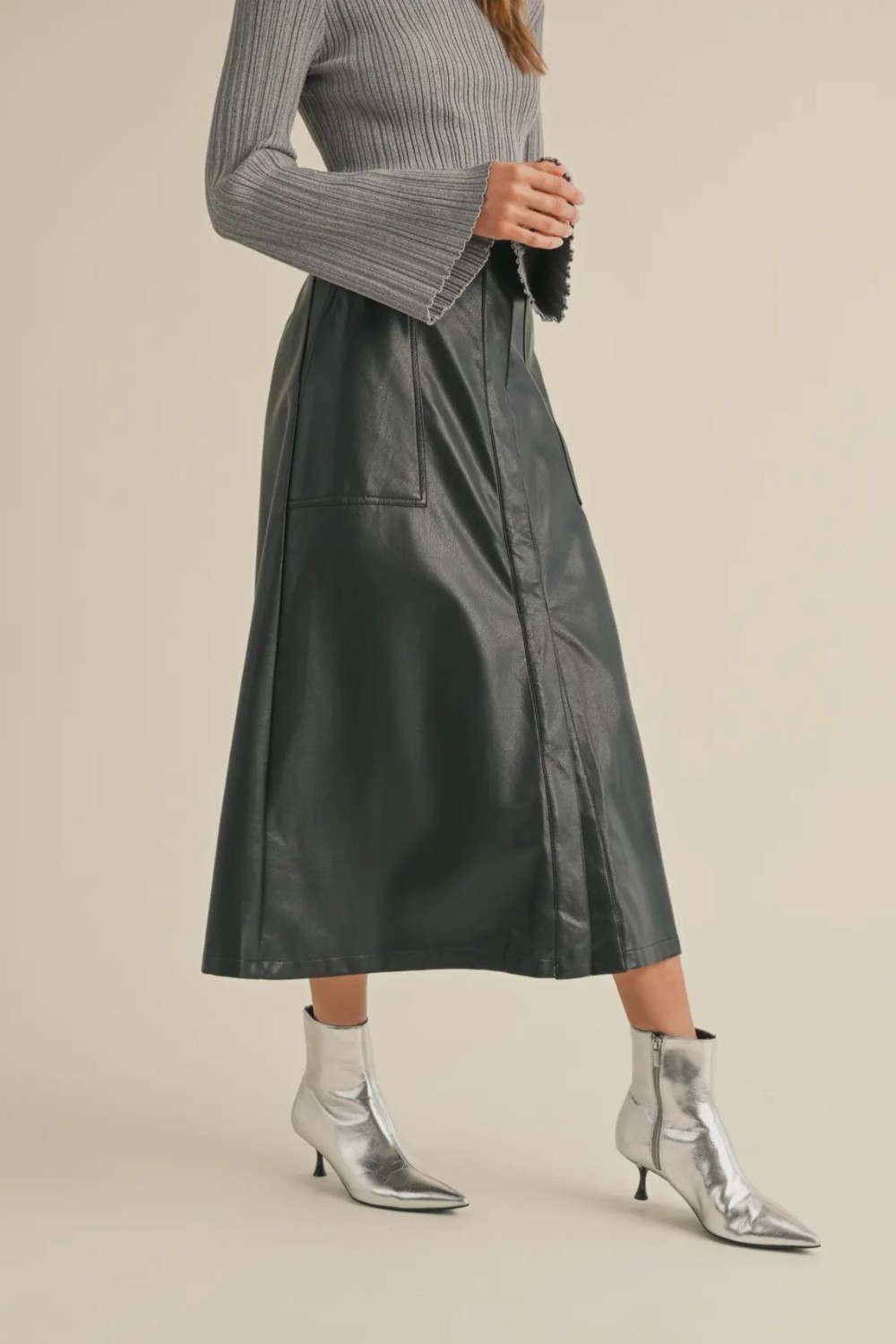 Step into effortless edge with this chic faux leather midi skirt. Designed with a flattering A-line silhouette, it features clean paneling, front pockets, and a smooth, structured finish that elevates any look. The high-rise waist and midi length make it perfect for pairing with cozy knits, sleek bodysuits, or tucked-in tees. Modern, versatile, and luxe—this skirt is the statement piece your wardrobe’s been waiting for /
