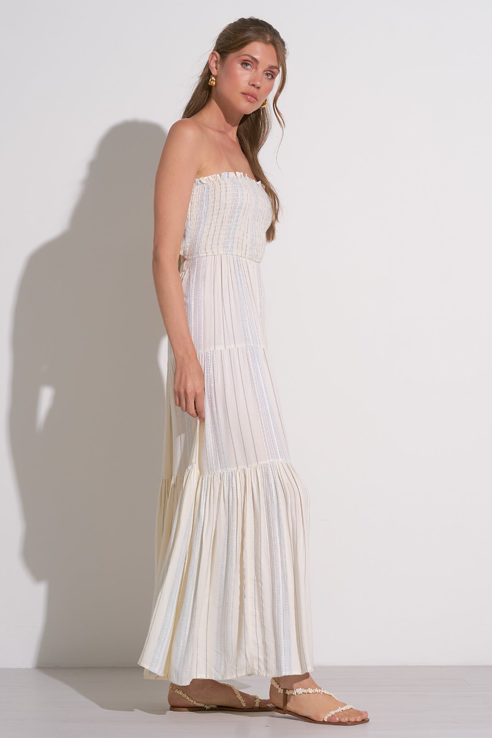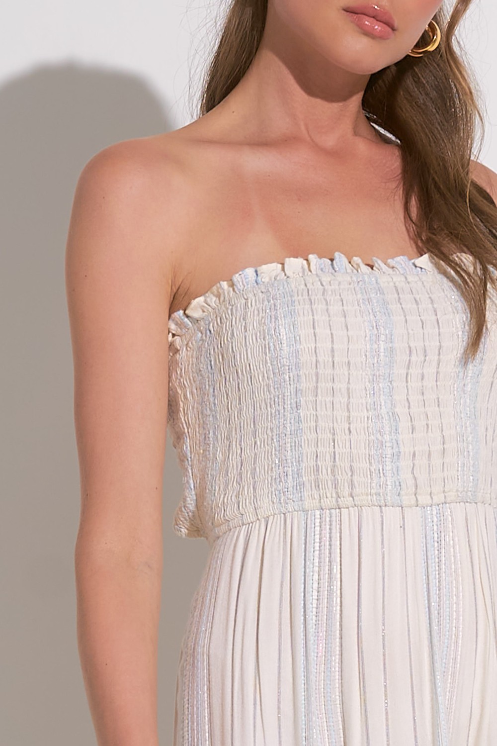 Embrace effortless elegance with our Ivory Blue Strapless Maxi Dress—a dreamy, flowy piece perfect for any occasion. Designed with a smocked bodice for a secure yet comfortable fit, this dress flatters your figure while allowing for all-day ease. The soft ivory fabric is delicately woven with subtle blue stripes, adding a touch of understated charm. Featuring a tiered silhouette for graceful movement, this lightweight maxi is ideal for warm-weather outings, beach vacations, or special summer events /