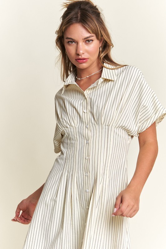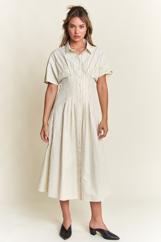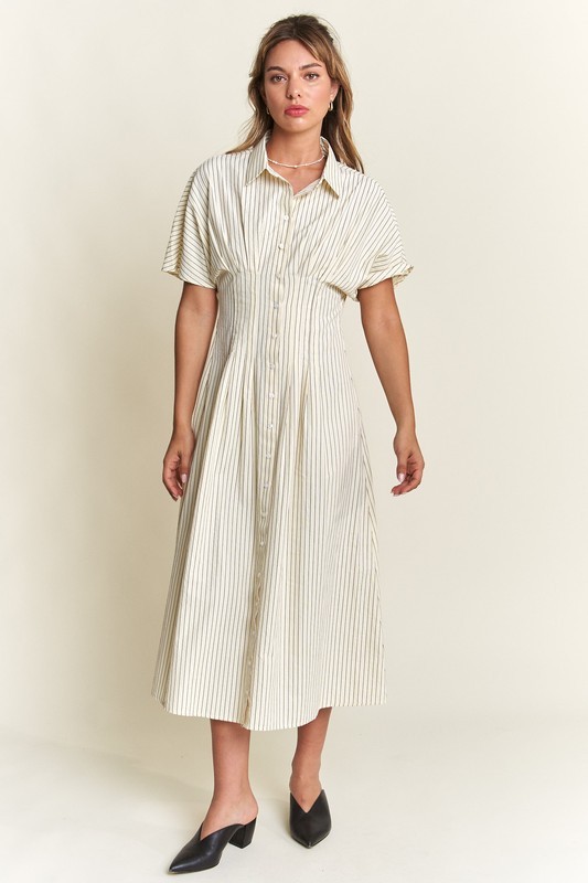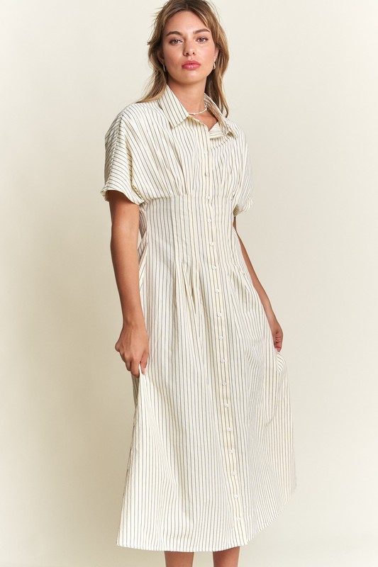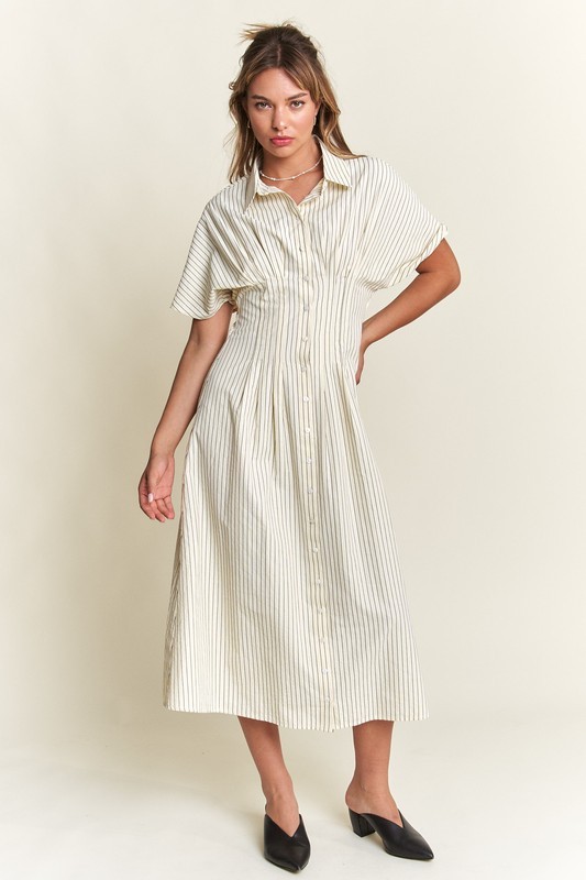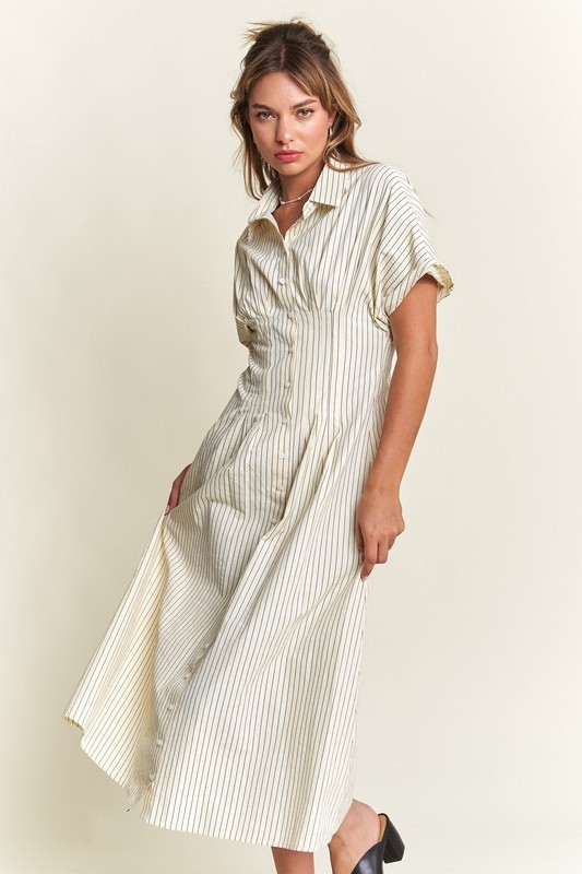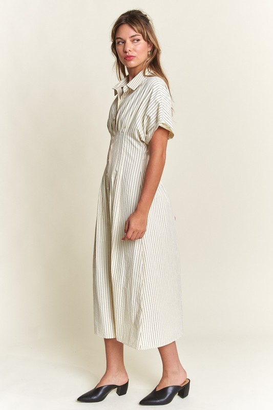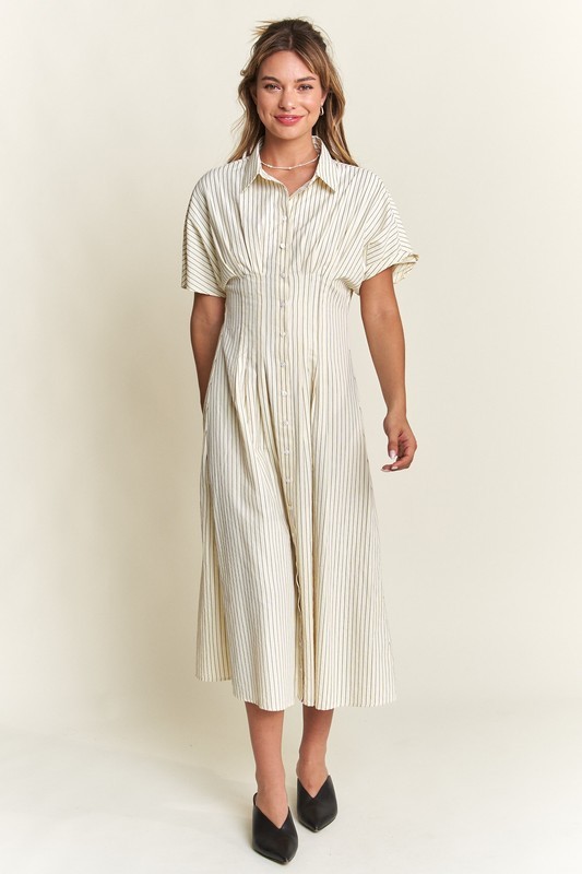 Timeless, chic, and effortlessly stylish—our Striped Button-Front Midi Dress is a must-have for your wardrobe! Designed with classic vertical stripes, this dress elongates your silhouette while offering a polished yet relaxed vibe. The collared neckline and short sleeves add a touch of sophistication, making it perfect for both casual and dressy occasions.