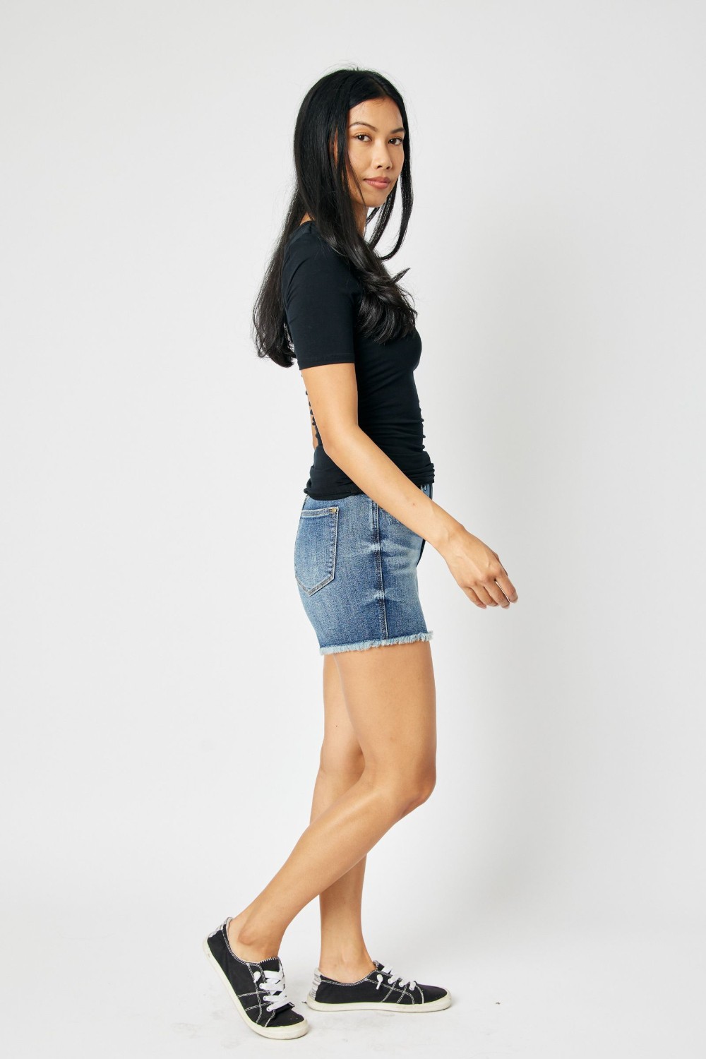 Judy Blue High Waist Fray Hem Shorts - High waist tummy control fray hem shorts with medium wash.