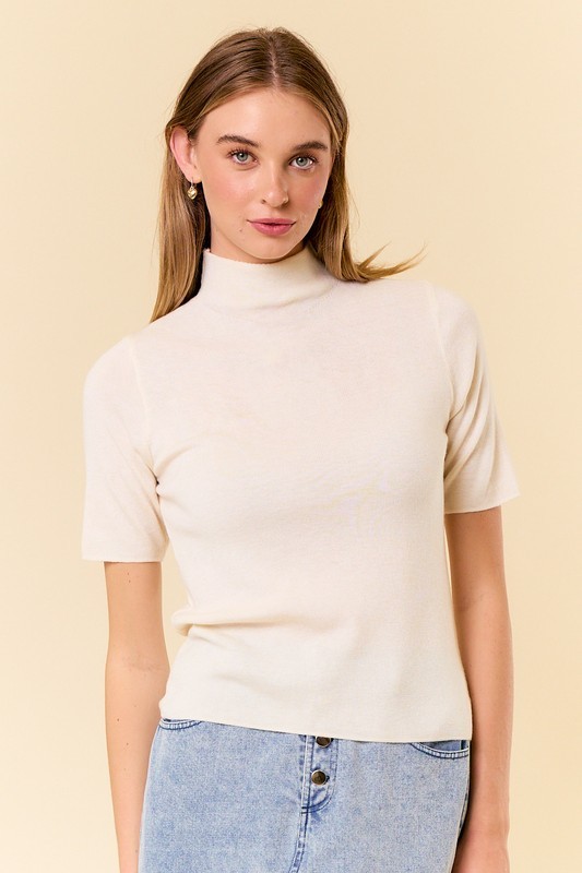 A sleek and effortless essential, this mock-neck sweater top features half sleeves and a flattering fitted silhouette. Made from soft, sweater-like fabric, it’s the perfect piece for transitional weather—easy to layer, timeless, and endlessly versatile.