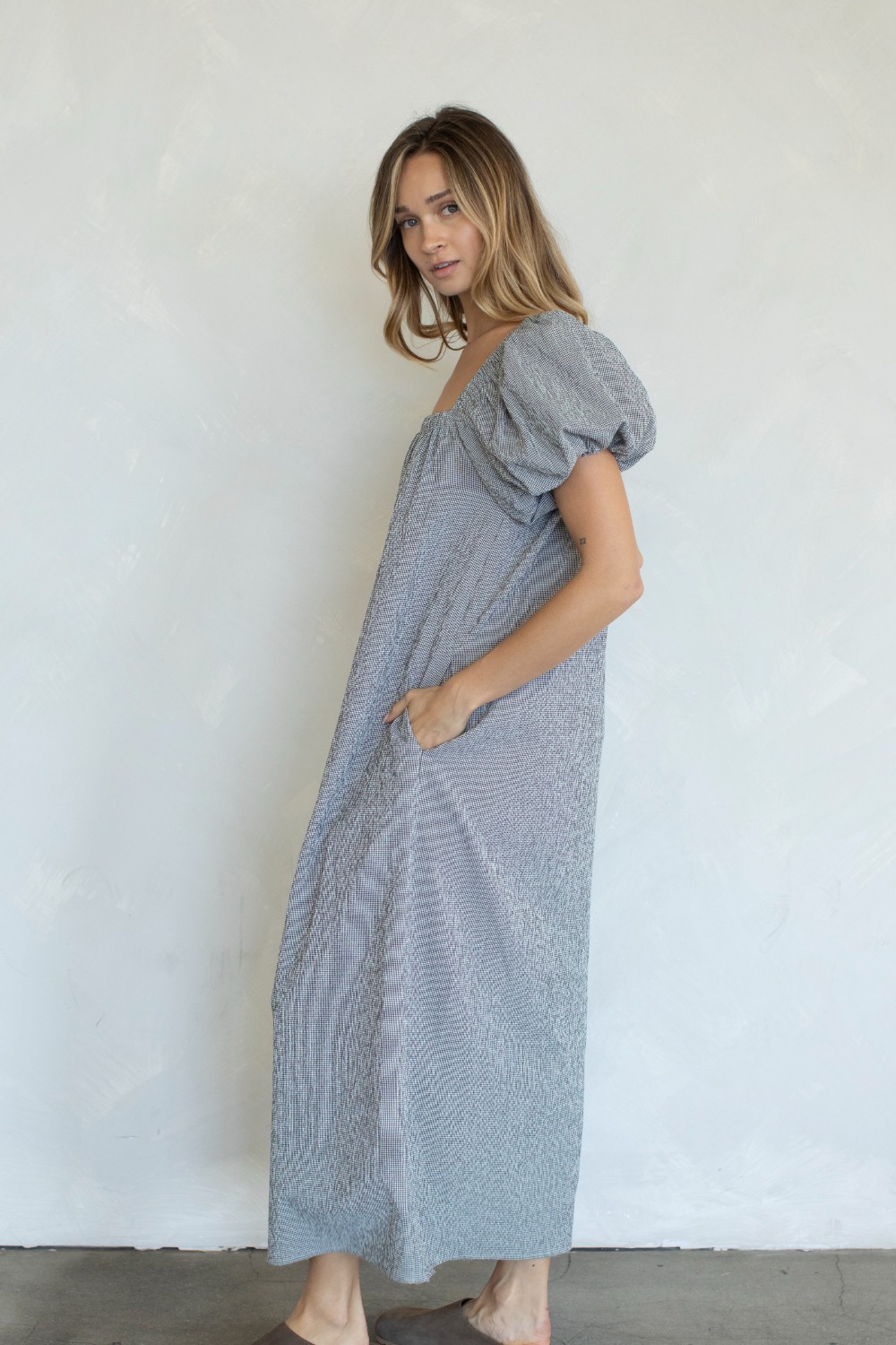 This effortless maxi dress features a softly textured fabric with a relaxed, flowy silhouette that’s both comfortable and flattering. Designed with a square neckline and short puff sleeves, it has gentle gathering at the bodice for an easy drape. Functional side pockets add everyday practicality, making this the perfect throw-on-and-go dress for warm days, casual outings, or dressed up with layered jewelry and sandals.